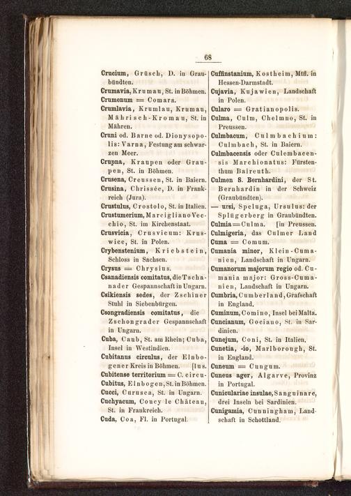 SpLüg erborg in Granbündten.Culmia = 0 u 1 m a. [in Preussen .Culmigeria, das Culm er LandCuma = Com um.Cumauia minor, Klein-Cum a-