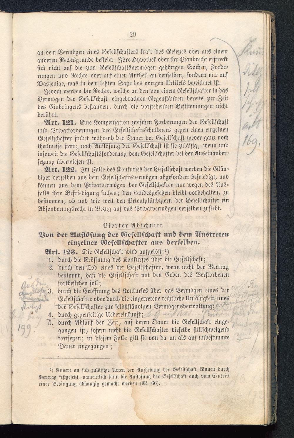 Art. 122. Im Falle des Konkurses der Gesellschaft werden die Gläu-biger derselben ans dem Gesellschaftsvermögen abgesondert befriedigt, undkönnen aus dem Privatvcrmvgen der Gesellschafter nur wegen des Aus-falls ihre Befriedigung suchen; den Landesgesetzen bleibt vorbehalten, zubestimmen, ob und wie weit den Privatgläubigern der Gesellschafter einAbsondernngsrecht in Bezug auf das Privatvcrmögcn derselben zusieht.