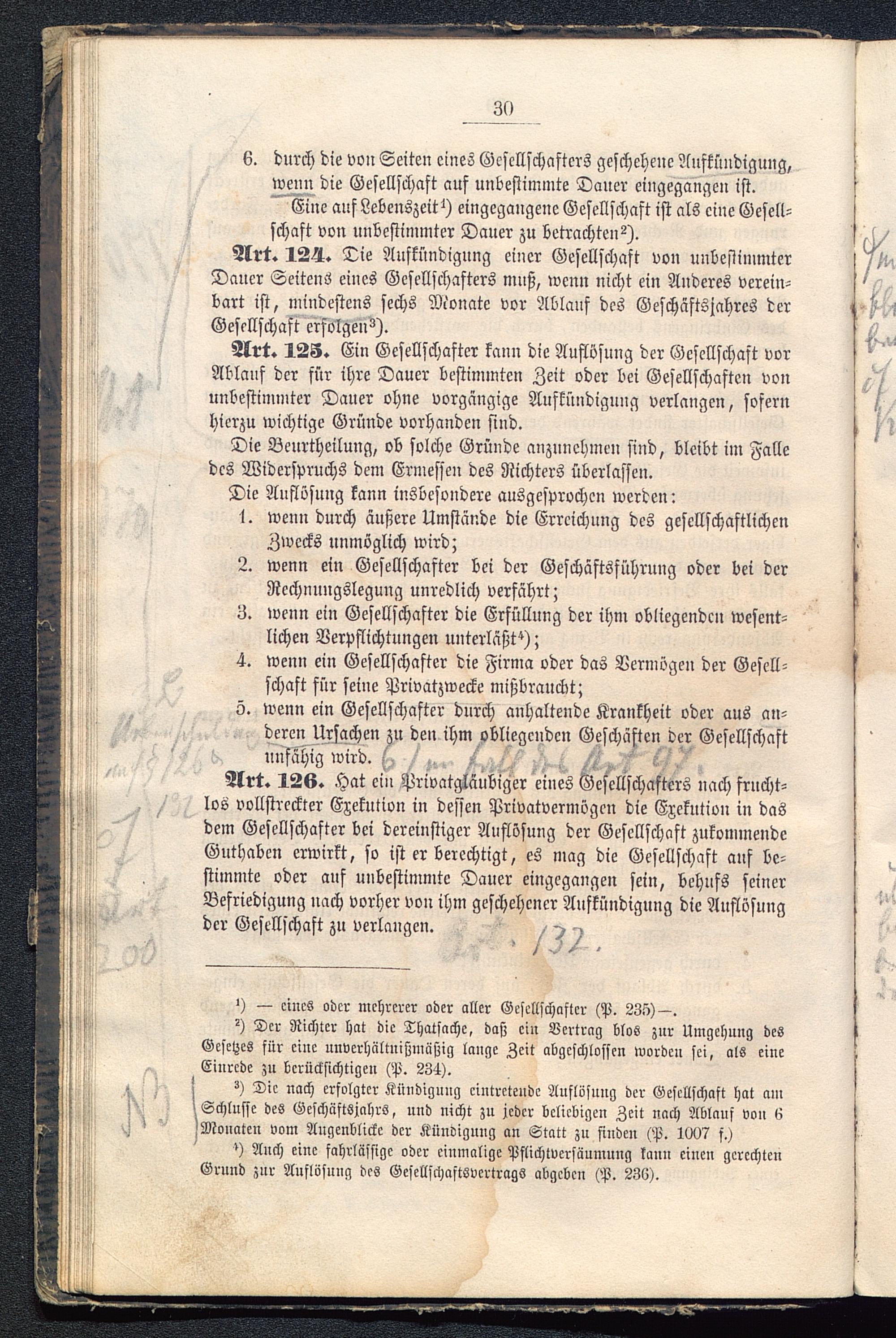 Art. 126. Hat ein Privatgläubiger eines Gesellschafters nach frucht-los vollstreckter Exekution in dessen Privatvermögcn die Exekution in dasdem Gesellschafter bei dereinstiger Auflösung der Gesellschaft zukommendeGuthaben erwirkt, so ist er berechtigt, es mag die Gesellschaft auf be-stimmte oder auf unbestimmte Dauer eingegangen sein, behufs seinerBefriedigung nach vorher von ihm geschehener Aufkündigung die Auflösungder Gesellschaft zu verlangen.