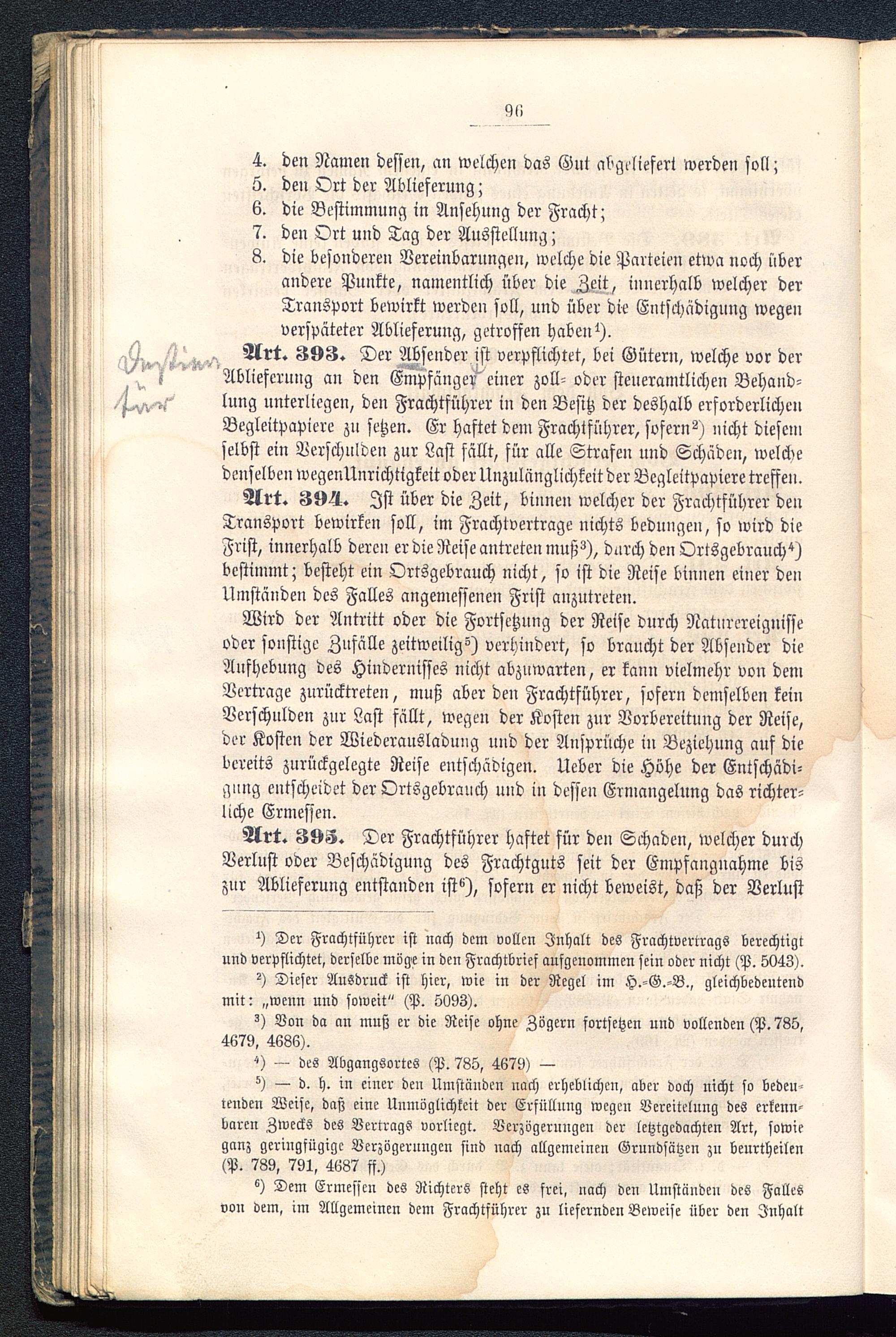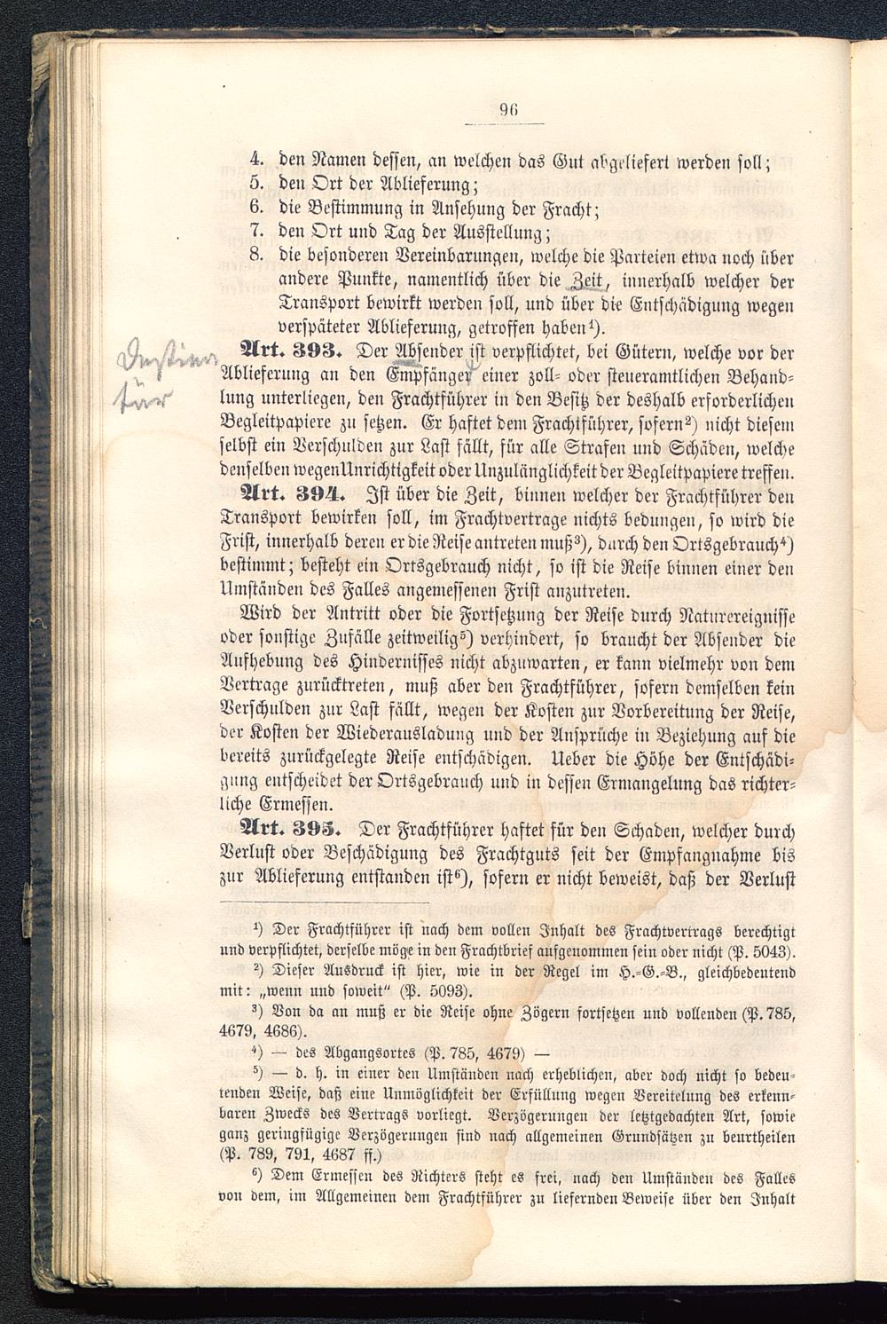 Art. 393. Der Absender ist verpflichtet, bei Gütern, welche vor derAblieferung an den Empfänge? einer zoll- oder steneramtlichen Behand-lung unterliegen, den Frachtführer in den Besitz der deshalb erforderlichenBegleitpapiere zu setzen. Er haftet dem Frachtführer, sofern?) nicht diesemselbst ein Verschulden zur Last fällt, für alle Strafen und Schäden, welchedenselben wegenUnrichtigkeit oder Unzulänglichkeit der Begleitpapiere treffen.