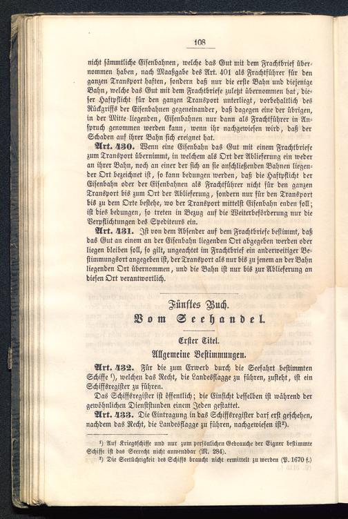 Art. 431. Ist von dem Absender auf dem Frachtbriefe bestimmt, daßdas Gut an einem an der Eisenbahn liegenden Ort abgegeben werden oderliegen bleiben soll, so gilt, ungeachtet im Frachtbrief ein anderweitiger Be-stimmungsort angegeben ist, der Transport als nur bis zu jenem an der Bahnliegenden Ort übernommen, und die Bahn ist nur bis zur Ablieferung andiesen Ort verantwortlich.