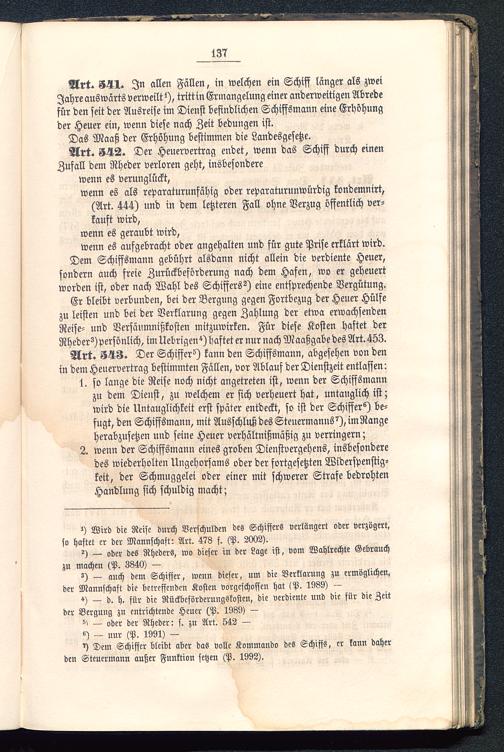 Art. 341. In allen Fällen, in welchen ein Schiff länger als zweiJahre auswärts verweilt*), trittin Ermangelung einer anderweitigen Abredefür den seit der Ausreise im Dienst befindlichen Schiffsmann eine Erhöhungder Heuer ein, wenn diese nach Zeit bedungen ist.