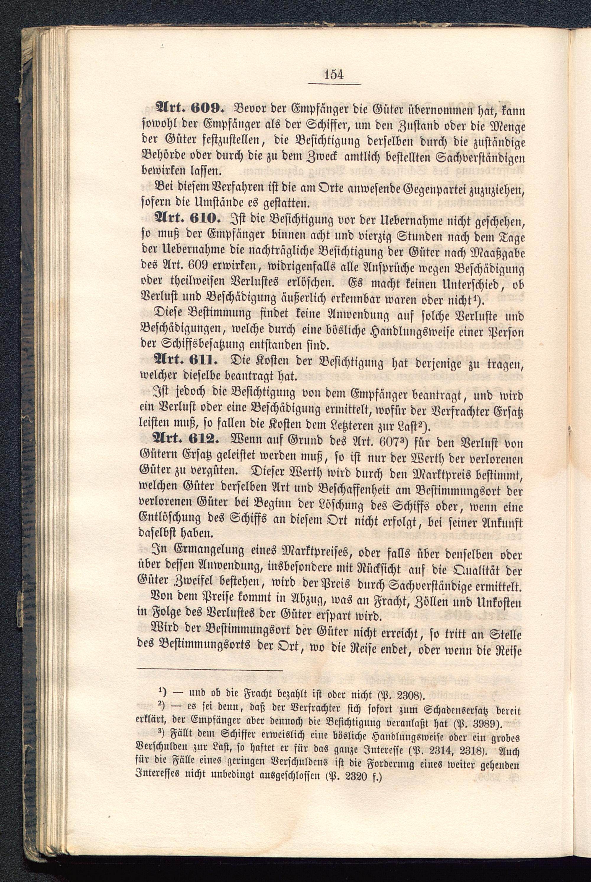 Art. 610. Ist die Besichtigung vor der Uebernahme nicht geschehen,so muß der Empfänger binnen acht und vierzig Stunden nach dem Tageder Uebernahme die nachträgliche Besichtigung der Güter nach Maaßgabedes Art. 609 erwirken, widrigenfalls alle Ansprüche wegen Beschädigungoder theilweisen Verlustes erlöschen. Es macht keinen Unterschied, obVerlust und Beschädigung äußerlich erkennbar waren oder nicht*).