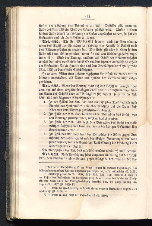 Art. 643. Wenn der Vertrag nicht auf das Schiff im Ganzen, son-dern nur auf einen verhältnißmäßigen Theil oder einen bestimmt bezeichne-ten Raum des Schiffs oder auf Stückgüter sich bezieht, so gelten die Art.630—642 mit folgenden Abweichungen?):