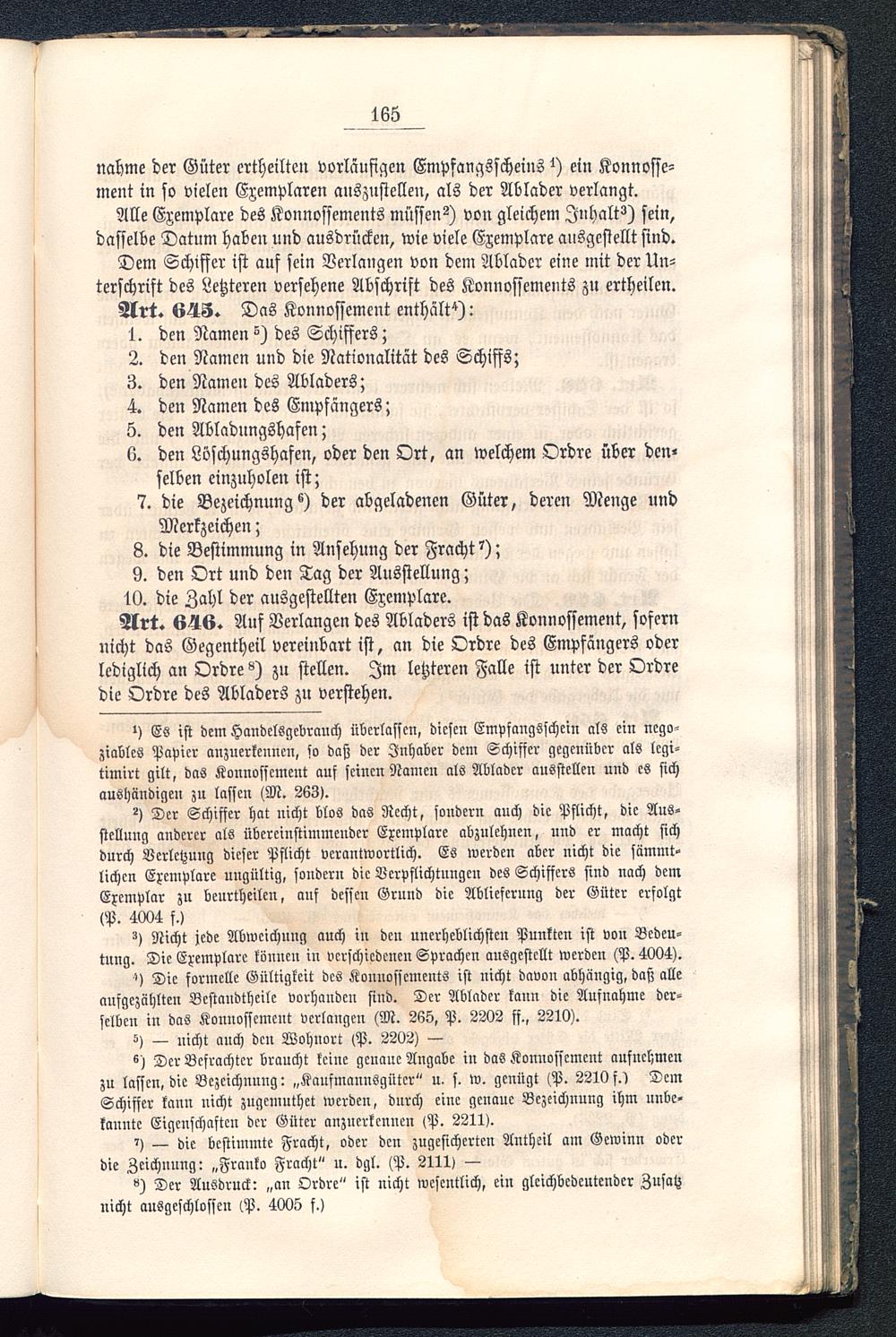 ') Die formelle Gültigkeit des Konnossements ist nicht davon abhängig, daß alleaufgezählten Bestandtheile vorhanden sind. Der Ablader kaun die Aufnahme der-selben in das Konnossement verlangen (M. 265, P. 2202 fs., 2210).