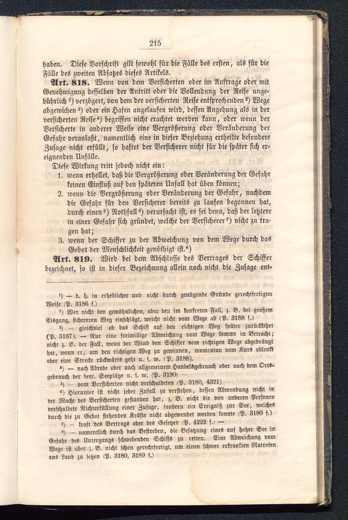Art. 818. Wenn von dem Versicherten oder im Auftrage oder mitGenehmigung desselben der Antritt oder die Vollendung der Reise unge-bührlich verzögert, von dem der versicherten Reise entsprechenden?) Wegeabgewichen») oder ein Hafen angelaufen wird, dessen Angehuug als in derversicherten Reises begriffen nicht erachtet werden kann, oder wenn derVersicherte in anderer Weise eine Vergrößerung oder Veränderung derGefahr veranlaßt, namentlich eine in dieser Beziehung ertheilte besondereZusage nicht erfüllt, so haftet der Versicherer nicht für die später sich er-eignenden Unfälle.