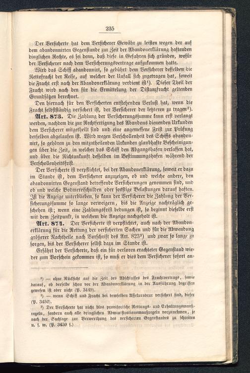 Art. 873. Die Zahlung der Versicherungssumme kann erst verlangtwerden, nachdem die zur Rechtfertigung des Abandons dienenden Urkundendem Versicherer mitgetheilt sind und eine angemessene Frist zur Prüfungderselben abgelaufen ist. Wird wegen Verschollenheit des Schiffs abandon-nirt, so gehören zu den mitzutheilenden Urkunden glaubhafte Bescheinigun-gen über die Zeit, in welcher das Schiff den Abgangshafen verlassen hat,und über die Nichtankunft desselben im Bestimmungshafen während derVerschollenheitsfrist