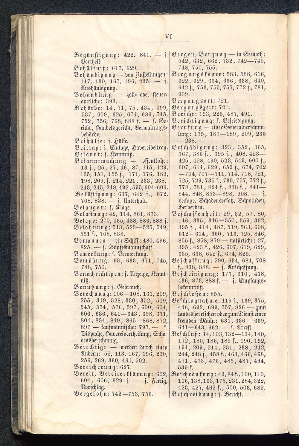 Beitrag: s. Einlage, Havereibeitrag.Bekannt: s. Kenntniß.Bekanntmachung — öffentliche:13 f., 25, 27, 46, 87, 115, 129,135, 151, 155 f., 171, 176, 189,198, 209, f. 214, 221, 233, 238,243, 245, 248,492,595,604-606.Beköstigung: 637, 642 f., 672,708, 838. — s. Unterhalt.Belangen: s. Klage.
