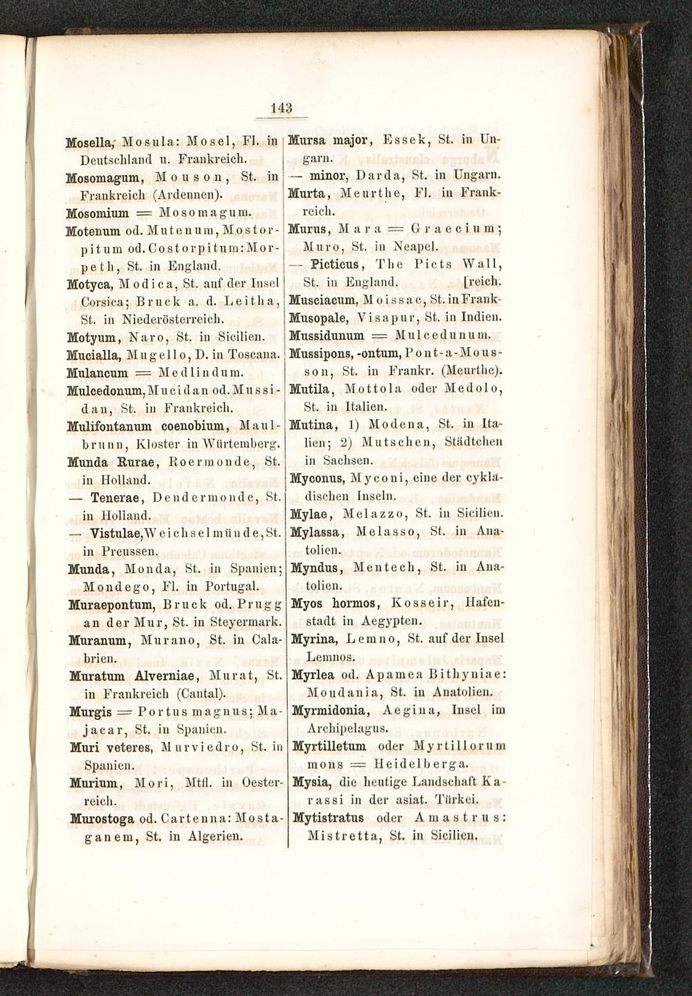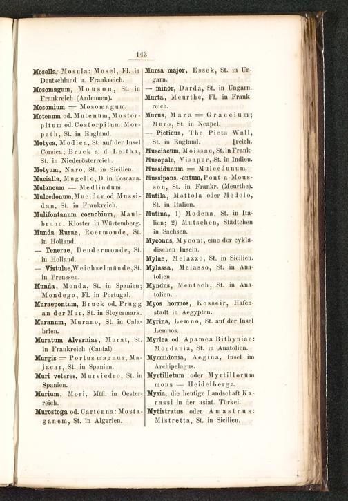 St. in Niederösterreich.Motyum, Naro , St. in Sieilien.Mucialla, Mugello, D. in Toscana .Mulancum = Mediin dum.Mulcedonum, M u c i d a n od. M u s s i -