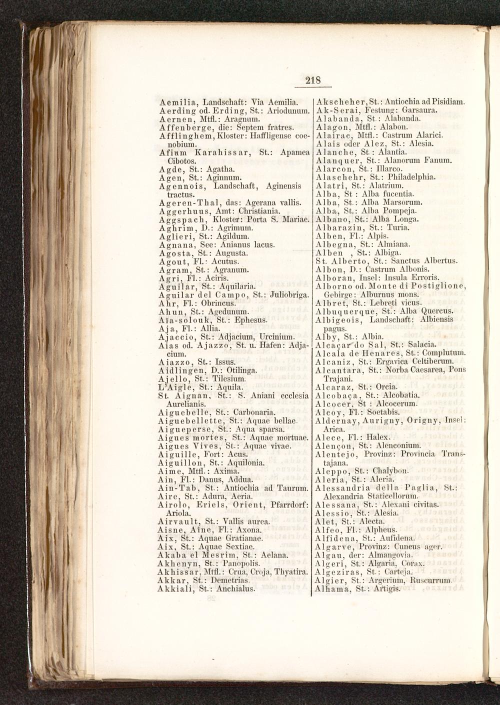 Alexandria Slaticellorum.Alessana, St.: Alöxahi civitas.Alessio, St.: Alesia.Alet, St.: Alecta.Alfeo, l*'l.: Alpheus.Alfide na, St.: Aufidena.Algarve, I'rovinz: Cunetls ager.Algau, der: Almangovia.Algeri , St.: Algaria, CVtrax.Algeziras, St.: Carteja.Algier , St.: Argerium, Ruscurrum.Aliiama, St.: Artigis.