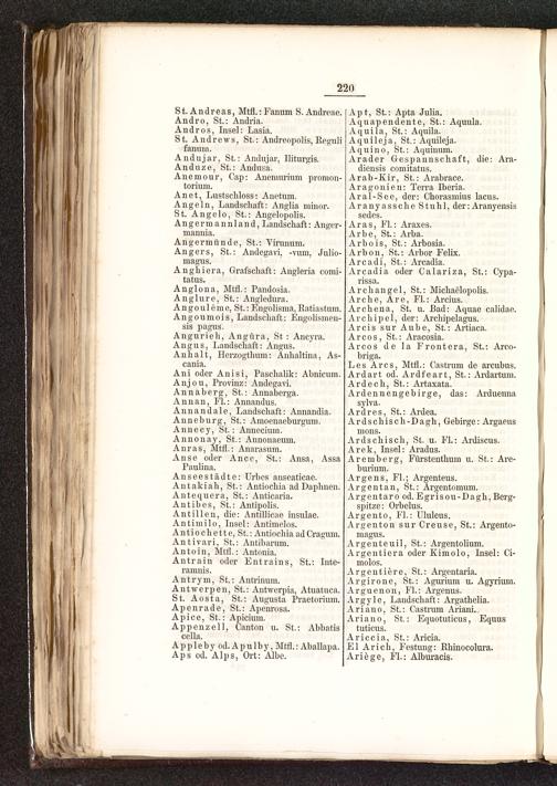 ramnis.Antrym, St.: Antrinum.Antwerpen, St.: Antwerpia , Atuatuca.St. Aosta , St.: Augusta Praetorium.Apenrade , St.: Apenrosa.Apice, St.: Apicium.Appenzell, Canton u. St.: Abbatis