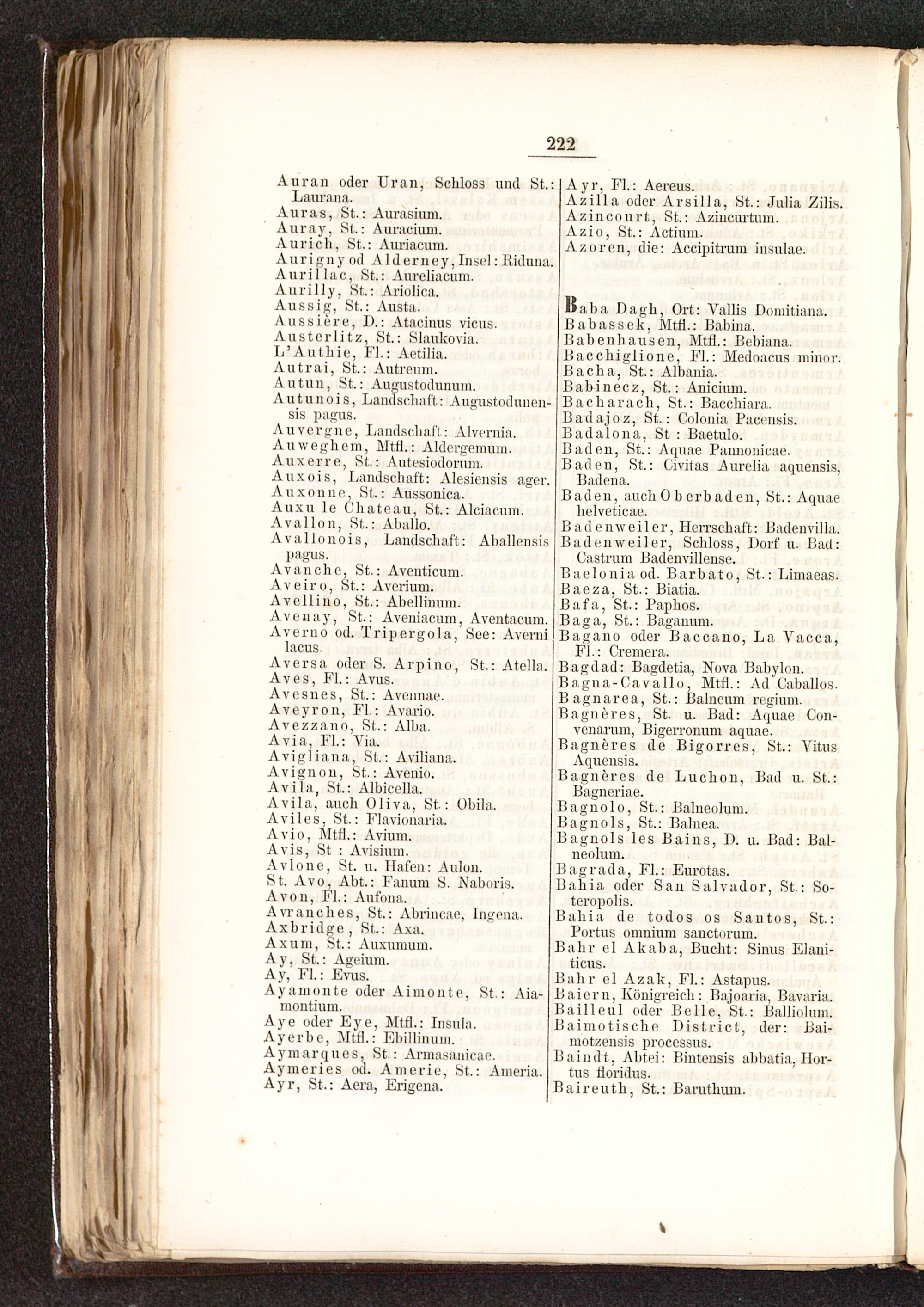 Kaba Dagh, Ort: Vallis Domitdana.Babassek, Mtfl.: Sabina.Babenhausen, Mtfl.: Bebiana.Bacchiglione, Fl.: Medoacus minor.Bacha, St.: Albania.Babinecz, St.: Aniciuni.Bacharach, St.: Bacchiara.Badajoz , St.: Colonia Pacensis.Badalona . St : Bactulo.Baden, St.: Aqüae Pannonicae.Baden, St.: Civitas Aurelia aquensis,Badena.