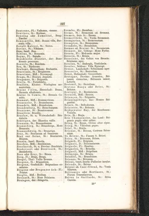 St. Brieuc , St.: Fauum S. Brioci.Briey, St.: Bricesum, Brium.Brigach, FL: Brigiana.Brignais, 1). : Priscinniacum.Brignole, FL: Boactus.Brignoles , St.: Brinolia.Brigueil, Mtfl,: Brigolium.Brihuega, St.: Briaca.Brindisi, St.: Brundisium .Briones, St.: Brionum.Brioni , venet. Inseln: Pullariae insulae.Brioude , St.: Brivas.Bristol od. Caer-Gwend, St.: VentaSilurum.