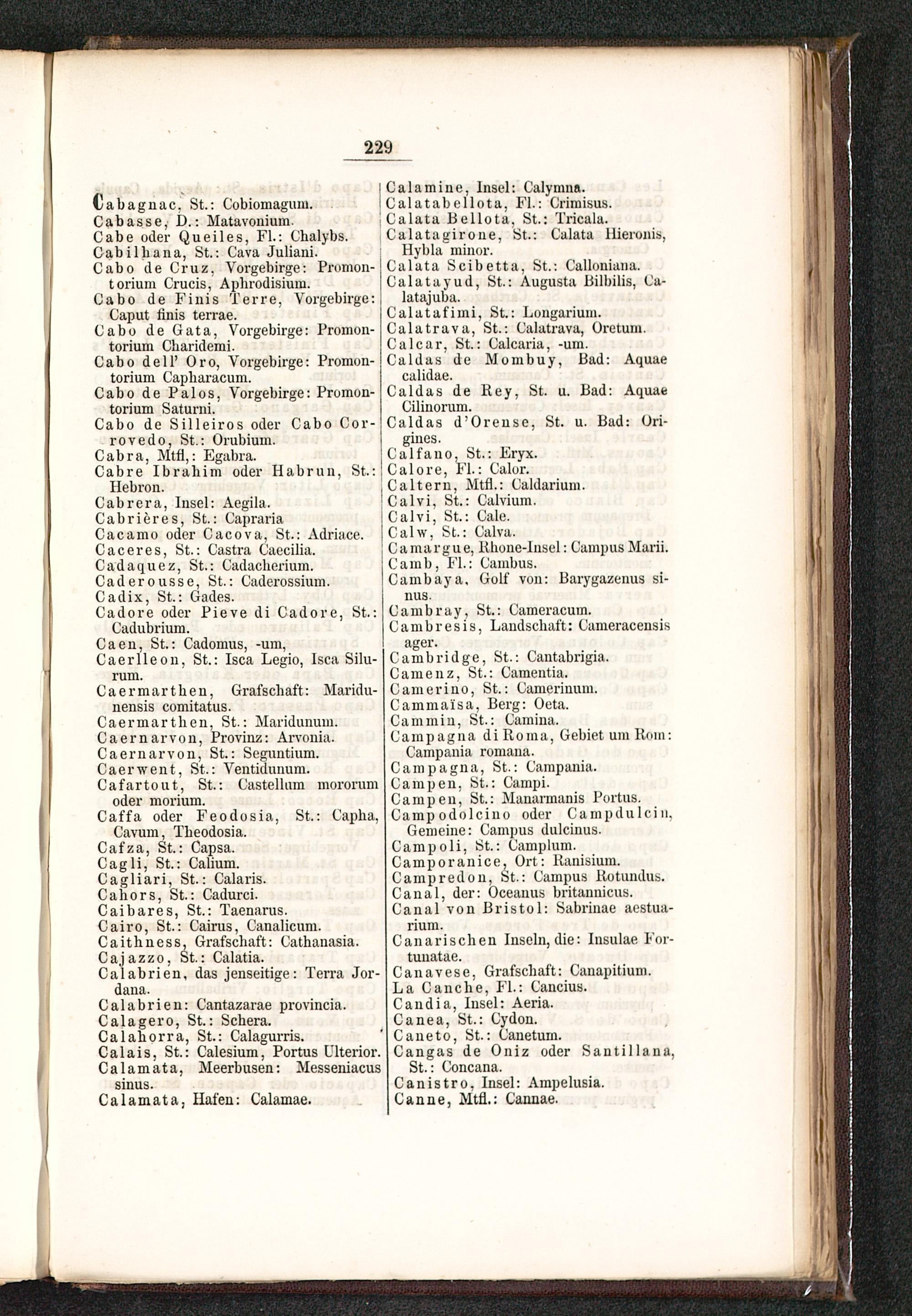 Cavum, Theodosia .Cafza, St.: Capsa.Cagli, St.: Calium .Cagliari, St.: Calaris.Cahors , St.: Cadurci.Caibares, St.: Taenarus.Cairo, St.: Cairus , Canalicum.Caithness, Grafschaft: Cathanasia.Cajazzo , St.: Calatia.Calabrien, das jenseitige: Terra Jor-