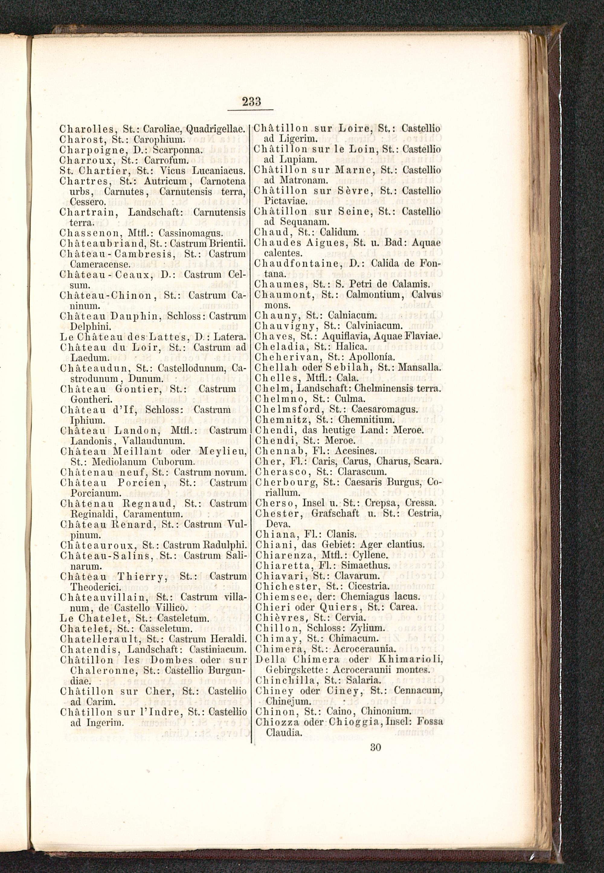 Chiana, Fl.: Clanis.Chiani, das Gebiet: Ager clantius.Chiarenza, Mtfl.: Cyllene.Ciliaretta, Fl.: Simaethus.Chiavari, St.: Clavarum .Chi ehester, St.: Cicestria.Chiemsee , der: Chemiagus lacus.Chieri oder Quiers, St.: Carea.Chievres, St.: Cervia .Chillon , Schloss: Zylium.Chimay, St.: Chimacum.Chiniera, St.: Acroceraunia.Deila Chimera oder Khimarioli,