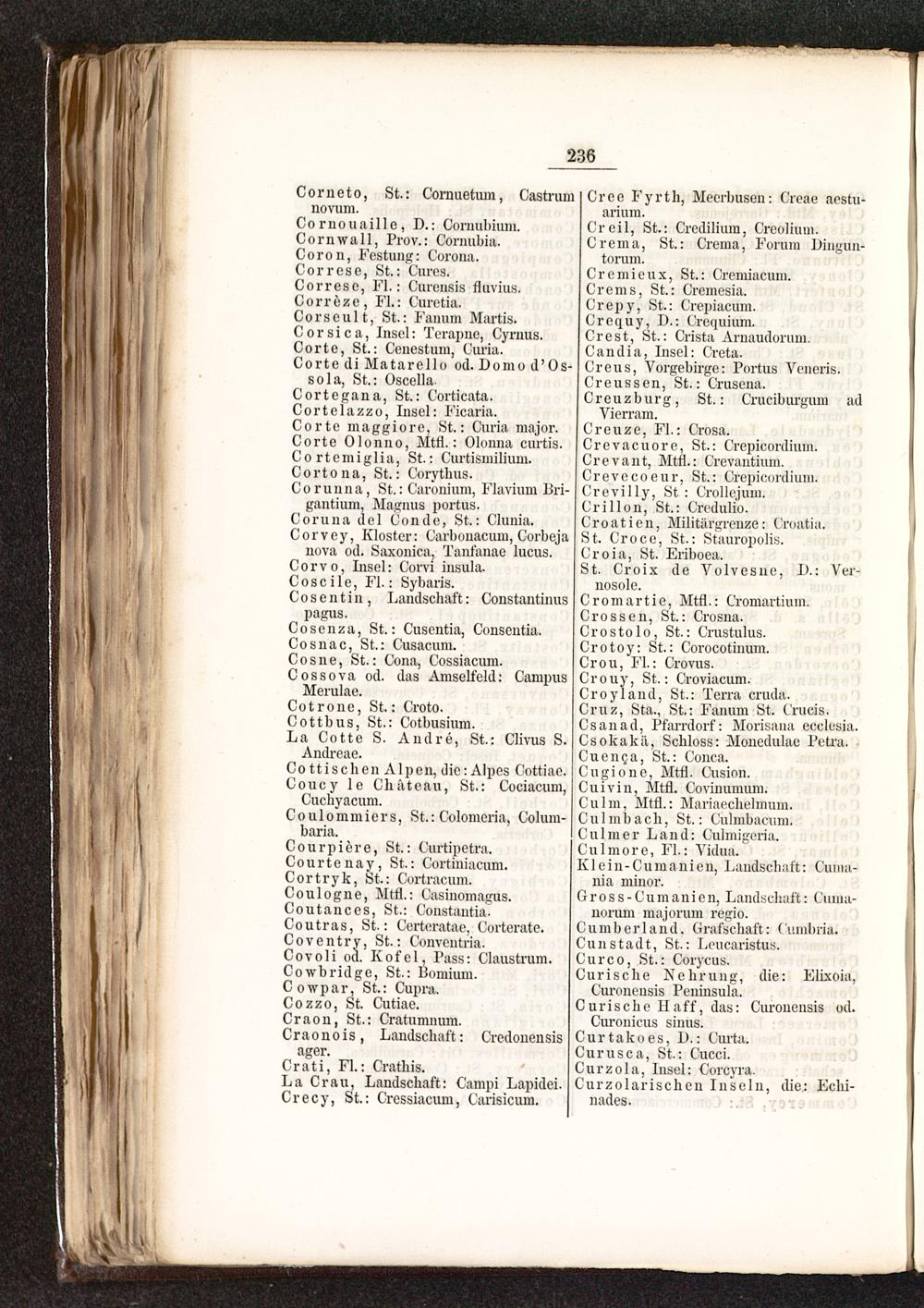Cosenza , St.: Cusentia, Conseutia.Cosnac, St.: Cusacum.Cosne, St.: Cona, Cossiacum.Cossova od. das Amselfeld: Campus