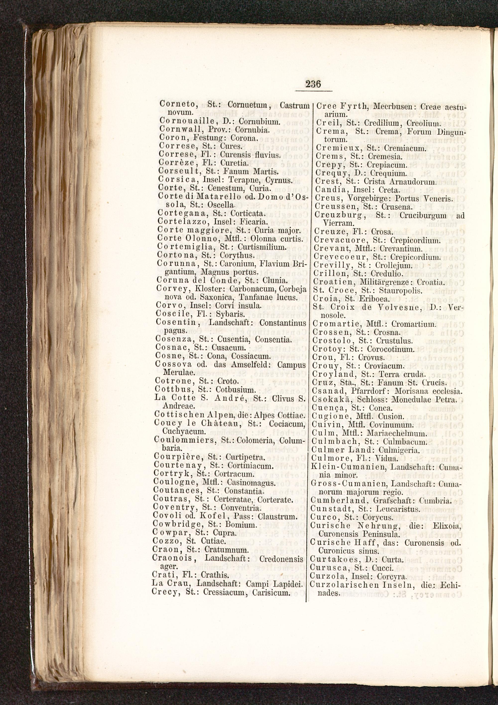 Vierram .Creuze, Fl.: Crosa.Crevacuore, St.: OrepicordiumtCrevant, Mtfl.: Crevantiuni.Crevccoeur, St.: Crepieordium.Crevilly, St : Crollejum.Crillon, St.: Credulio.Croatien, Militärgrenze( Croatia .St. Croce, St.: Stauropolis.Croia, St. Eriboea.St. Croix de Volvesne, !>.: Ver-