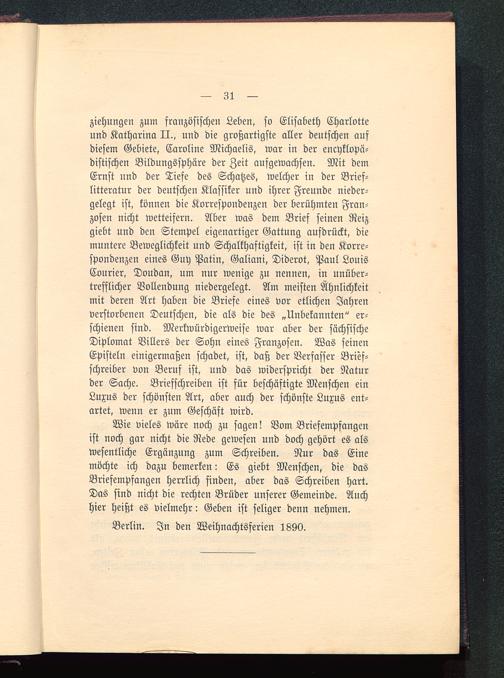 Ziehungen zum französischen Leben, so Elisabeth Charlotte und Katharina II. , und die großartigste aller deutschen aufdiesem Gebiete, Caroline Michaelis, war in der encyklopä-distischen Bildungssphäre der Zeit aufgewachsen. Mit demErnst und der Tiefe des Schatzes, welcher in der Brief-litteratur der deutschen Klassiker und ihrer Freunde nieder-gelegt ist, können die Korrespondenzen der berühmten Fran-zosen nicht wetteifern. Aber was dem Brief feinen Reizgiebt und den Stempel eigenartiger Gattung aufdrückt, diemuntere Beweglichkeit und Schalkhaftigkeit, ist in den Korre-spondenzen eines Guy Patin , Galiani, Diderot, Paul LouisCourier, Doudan, um nur wenige zu nennen, in unüber-trefflicher Vollendung niedergelegt. Am meisten Ähnlichkeitmit deren Art haben die Briefe eines vor etlichen Jahrenverstorbenen Deutschen , die als die des „Unbekannten" er-schienen sind. Merkwürdigerweise war aber der sächsischeDiplomat Villers der Sohn eines Franzosen . Was seinenEpisteln einigermaßen schadet, ist, daß der Verfasfer Brief-schreiber von Beruf ist, und das widerspricht der Naturder Sache. Briefschreiben ist für beschäftigte Menschen einLuxus der schönsten Art, aber auch der schönste Luxus ent-artet, wenn er zum Geschäft wird.