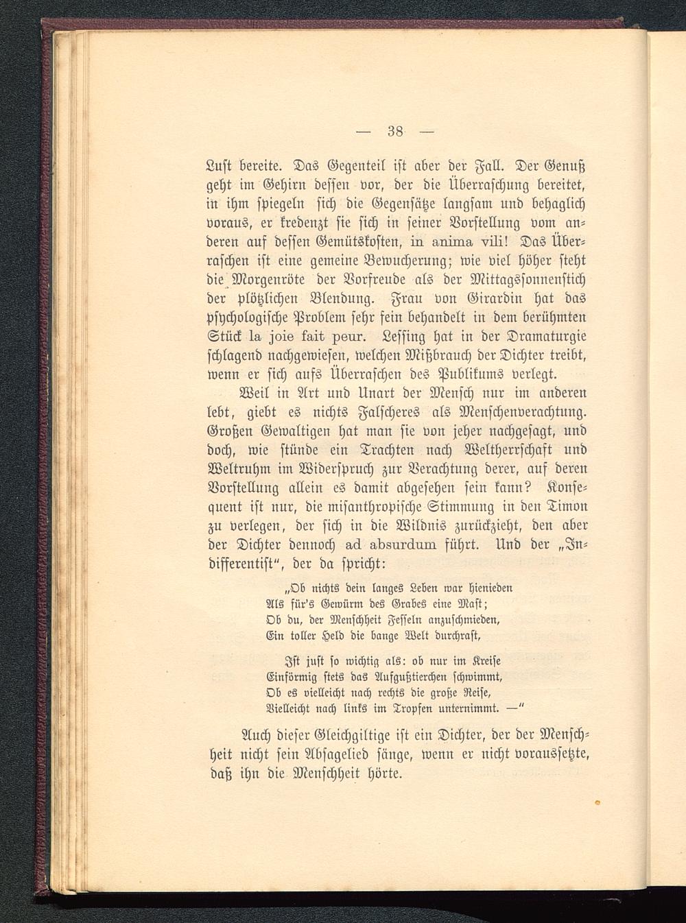 Weil in Art und Unart der Mensch nur im anderenlebt, giebt es nichts Falscheres als Menschenverachtung.Großen Gewaltigen hat man sie von jeher nachgesagt, unddoch, wie stünde ein Trachten nach Weltherrschaft undWeltruhm im Widerspruch zur Verachtung derer, auf derenVorstellung allein es damit abgesehen sein kann? Konse-quent ist nur, die misanthropische Stimmung in den Timonzu verlegen, der sich in die Wildnis zurückzieht, den aberder Dichter dennoch ad absurdem führt. Und der „Jn-differentist", der da spricht: