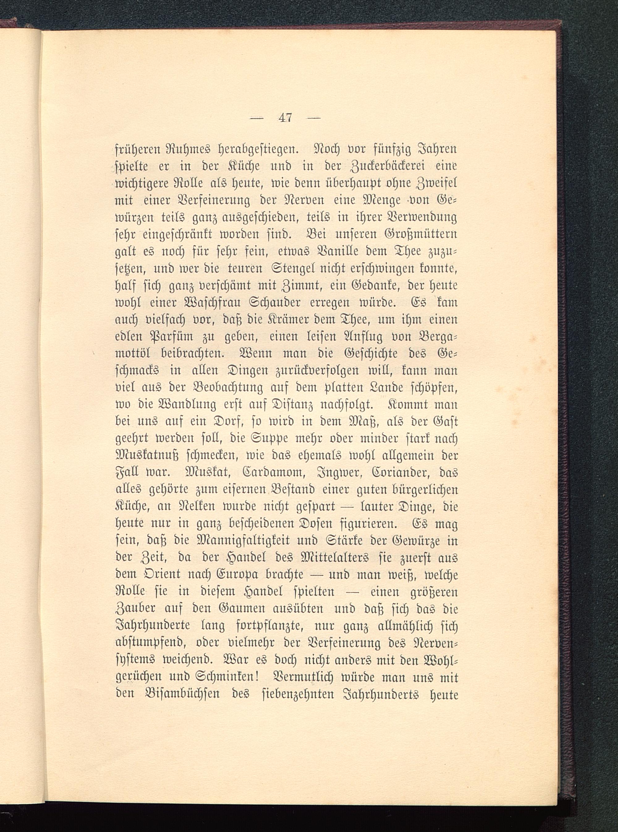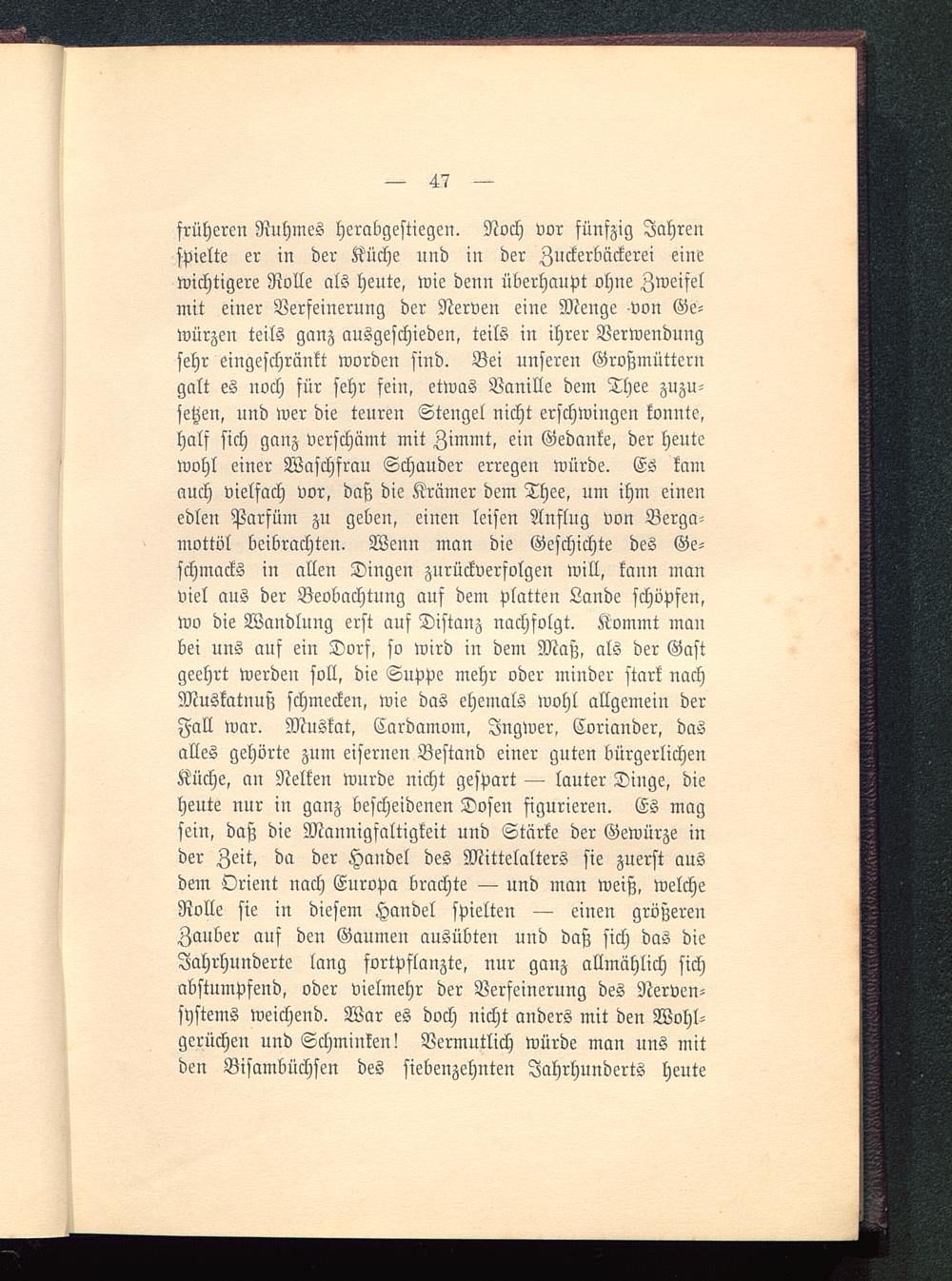früheren Ruhmes herabgestiegen. Noch vor fünfzig Jahrenspielte er in der Küche und in der Znckerbäckerei einewichtigere Rolle als heute, wie denn überhaupt ohne Zweifelmit einer Verfeinerung der Nerven eine Menge -von Ge-würzen teils ganz ausgeschieden, teils in ihrer Verwendungsehr eingeschränkt worden sind. Bei unseren Großmütterngalt es noch für sehr fein, etwas Vanille dem Thee zuzu-setzen, und wer die teuren Stengel nicht erschwingen konnte,half sich ganz verschämt mit Zimmt, ein Gedanke, der heutewohl einer Waschfrau Schauder erregen würde. Es kamauch vielfach vor, daß die Krämer dem Thee, um ihm einenedlen Parfüm zu geben, einen leisen Anfing von Berga-mottöl beibrachten. Wenn man die Geschichte des Ge-schmacks in allen Dingen zurückverfolgen will, kann manviel aus der Beobachtung auf dem Platten Lande schöpfen,wo die Wandlung erst auf Distanz nachfolgt. Kommt manbei uns auf ein Dorf, so wird in dem Maß, als der Gastgeehrt werden soll, die Suppe mehr oder minder stark nachMuskatnuß schmecken, wie das ehemals wohl allgemein derFall war. Muskat, Cardamom, Ingwer, Coriander, dasalles gehörte zum eiserneu Bestand einer guten bürgerlichenKüche, an Nelken wurde nicht gespart — lauter Dinge, dieheute nur in ganz bescheidenen Dosen figurieren. Es magsein, daß die Mannigfaltigkeit und Stärke der Gewürze inder Zeit, da der Handel des Mittelalters sie zuerst ausdem Orient nach Europa brachte — und man weiß, welcheRolle sie in diesem Handel spielten — einen größerenZauber auf den Gaumen ausübten und daß sich das dieJahrhunderte lang fortpflanzte, nur ganz allmählich sichabstumpfend, oder vielmehr der Verfeinerung des Nerven-systems weichend. War es doch nicht anders mit den Wohl-gerüchen und Schminken! Vermutlich würde man uns mitden Bisambüchsen des siebenzehnten Jahrhunderts heute