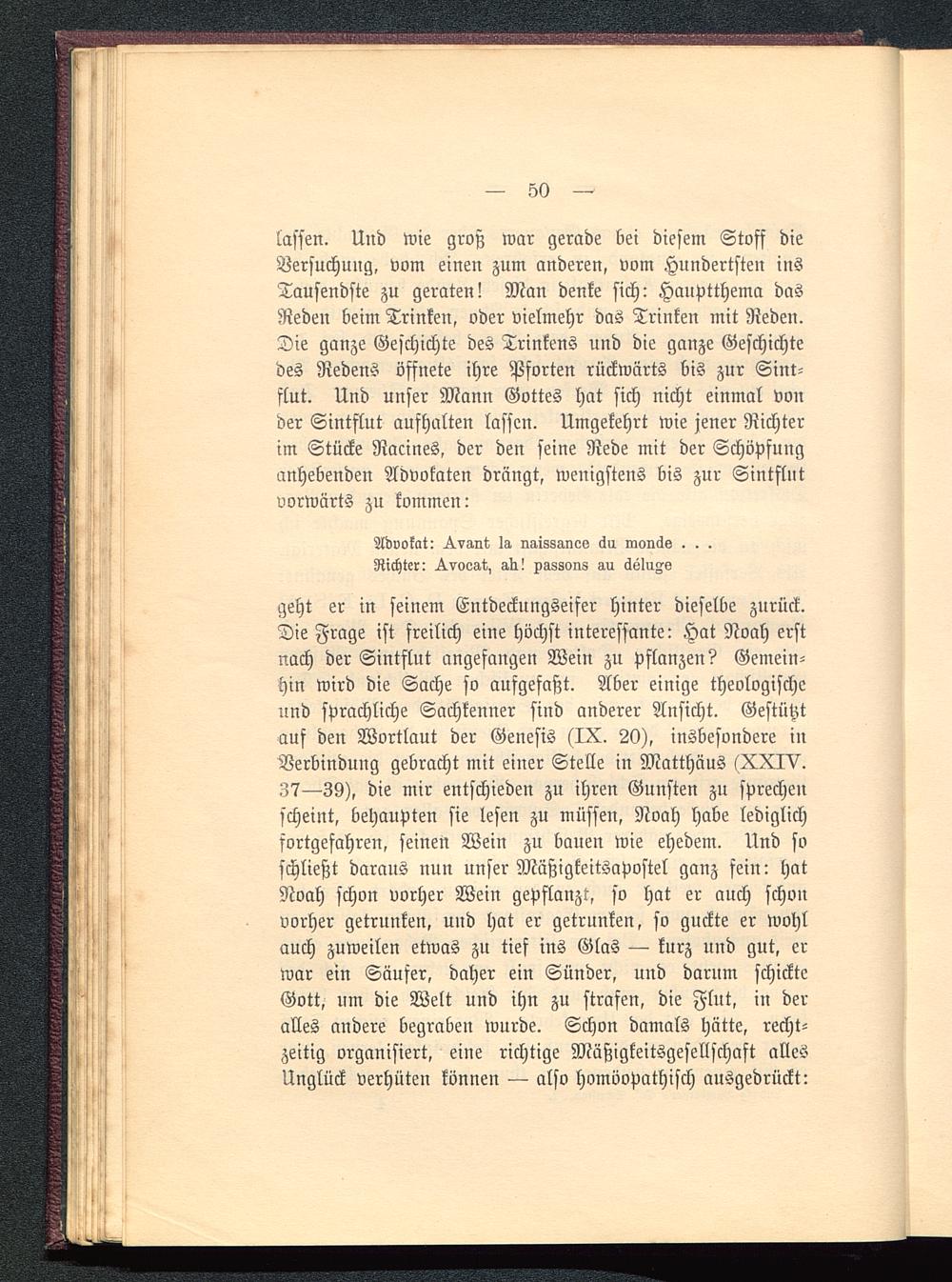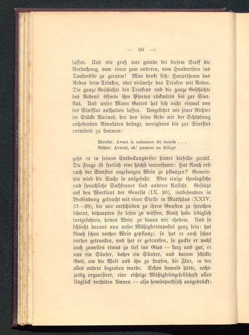 lassen. Und wie groß war gerade bei diesem Stoff dieVersuchung, vom einen zum anderen, vom Hundertsten insTausendste zu geraten! Man denke sich: Hauptthema dasReden beim Trinken, oder vielmehr das Trinken mit Reden.Die ganze Geschichte des Trinkens und die ganze Geschichtedes Redens öffnete ihre Pforten rückwärts bis zur Sint-flut. Und unser Mann Gottes hat sich nicht einmal vonder Sintflut aufhalten lassen. Umgekehrt wie jener Richterim Stücke Racines, der den seine Rede mit der Schöpfunganhebenden Advokaten drängt, wenigstens bis zur Sintflutvorwärts zu kommen: