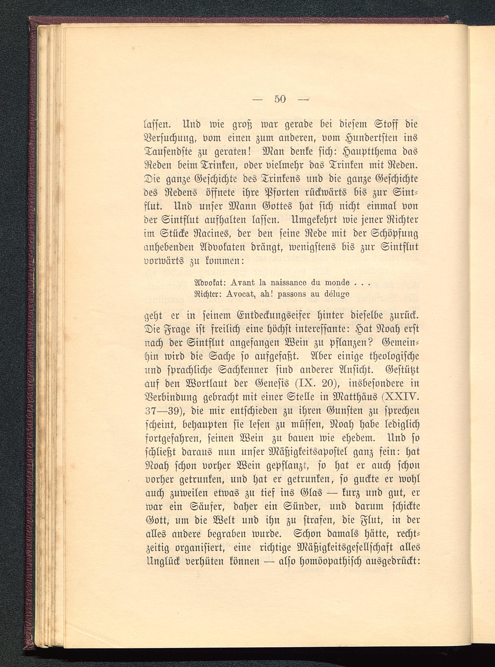 geht er in seinem Entdeckungseifer hinter dieselbe zurück.Die Frage ist freilich eine höchst interessante: Hat Noah erstnach der Sintflut angefangen Wein zu pflanzen? Gemein-hin wird die Sache so aufgefaßt. Aber einige theologischeund sprachliche Sachkenner sind anderer Ansicht. Gestütztauf den Wortlaut der Genesis (IX. 20), insbesondere inVerbindung gebracht mit einer Stelle in Matthäus (XXIV.Z7—39), die mir entschieden zu ihren Gunsten zu sprechenscheint, behaupten sie lesen zu müssen, Noah habe lediglichfortgefahren, seinen Wein zu bauen wie ehedem. Und soschließt daraus nun unser Müßigkeitsapostel ganz fein: hatNoah schon vorher Wein gepflanzt, so hat er auch schonvorher getrunken, und hat er getrunken, so guckte er wohlauch zuweilen etwas zu tief ins Glas — kurz und gut, erwar em Säufer, daher ein Sünder, und darum schickteGott , um die Welt und ihn zu strafen, die Flut, in deralles andere begraben wurde. Schon damals hätte, recht-zeitig organisiert, eine richtige Mäßigkeitsgesellschaft allesUnglück verhüten können — also homöopathisch ausgedrückt: