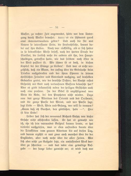 Wasser, zu rechter Zeit angewendet, hätte vor dem Unter-gang durch Wasser bewahrt, Kann'es ein schöneres <zuoäsrg-t, äsmonstrÄnduiQ geben? Und auch die für unsNeuere so interessante Seite, die strafrechtliche, kommt da-bei auf ihre Kosten. Noah war rückfällig, als er sich späterin so bedenklicher Weise besoff, nach der harten Strafe derSintflut, die freilich mehr die andern als ihn, den Haupt-schuldigen, getroffen hatte, wie das seitdem noch öfter inder Welt passiert ist. Wie schwer ist es doch, in diesemKapitel bei der Stange zu bleiben! Und war es nicht ver-zeihlich, daß ein Mann, der ansing über die Gebräuche beimTrinken nachzudenken und der ihren Spuren in seinemchristlichen Zeitalter und Vaterland nachging, auf denselbenGedanken geriet, wie der deutsche Dichter, der Noahs erstesGespräch mit Gott nach verlaufenen Wassern belauscht hat?Aber es giebt bekanntlich neben der heiligen Geschichte auchnoch eine profane. In der Bibel ist unzähligemal vomWein die Rede, bei den Propheten nicht minder. Dazunun das ganze Altertum des Orients und des Occidents,und die ganze Poesie des Weins, und wer Poesie sagt,sagt Liebe — Weib, Wein und Gesang, wer will sie trennen?„Kaum daß ich Bacchus, den göttlichen, habe —". Hierist kein Ende!