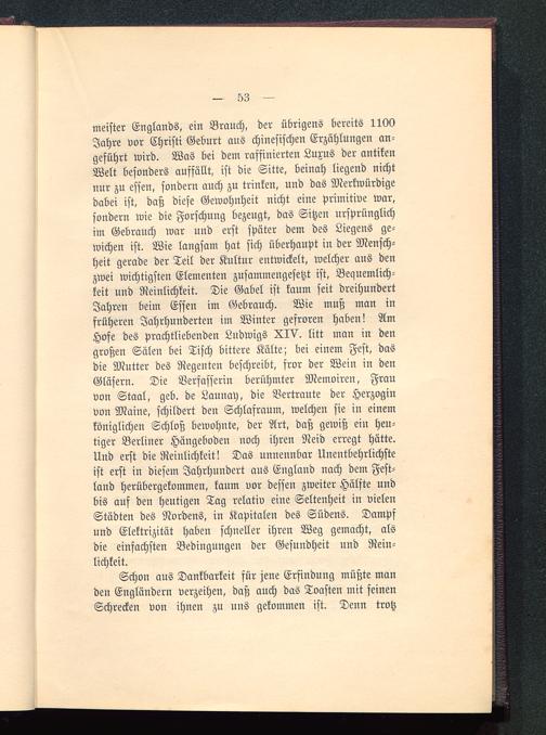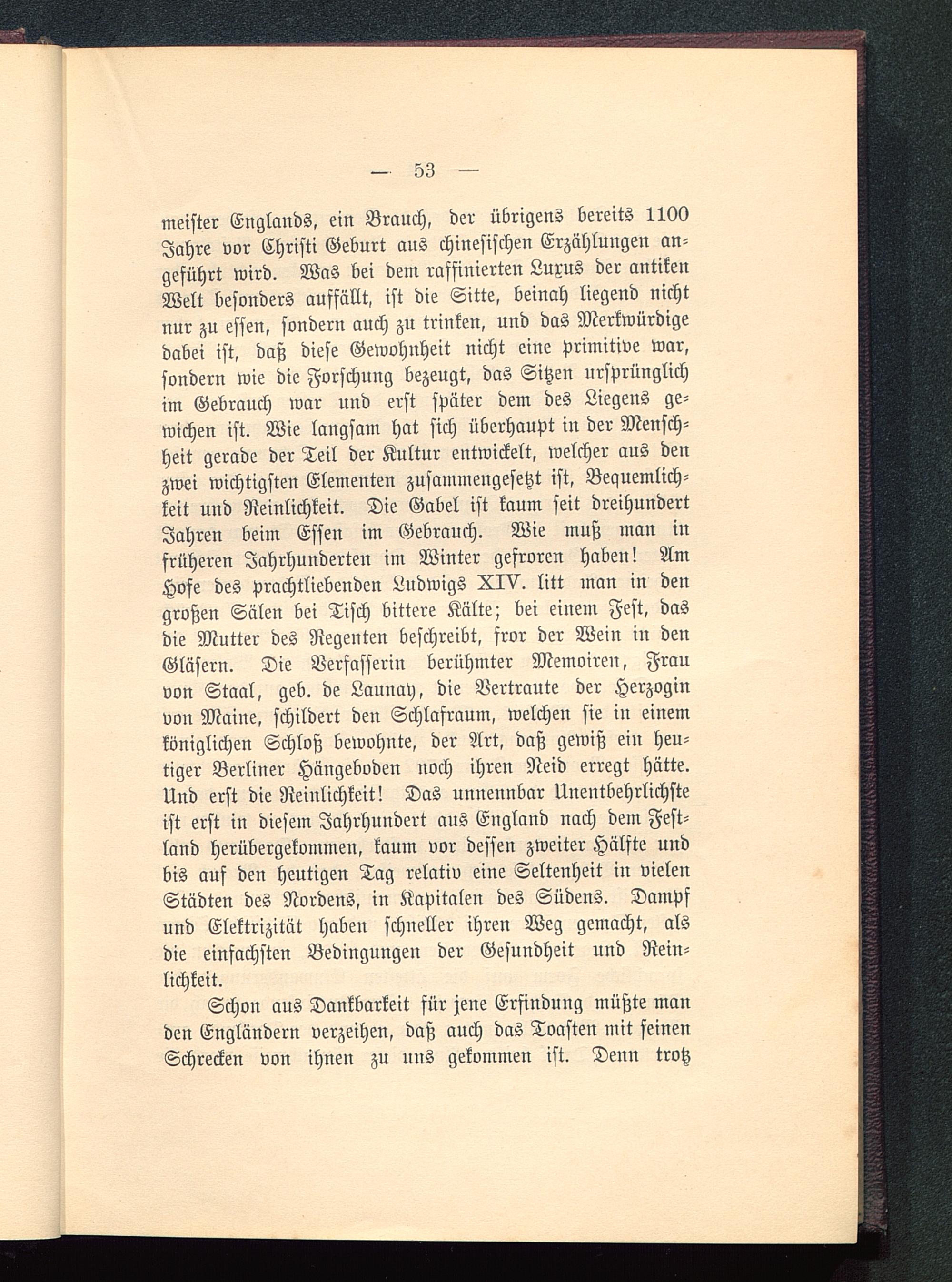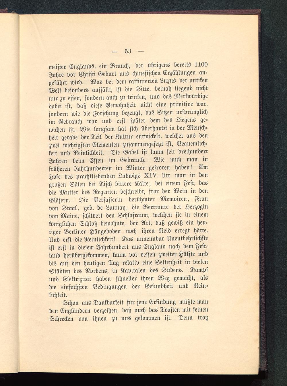 meister Englands , ein Brauch, der übrigens bereits 1100Jahre vor Christi Geburt aus chinesischen Erzählungen an-geführt wird. Was bei dem raffinierten Luxus der antikenWelt besonders auffällt, ist die Sitte, beinah liegend nichtnur zu essen, sondern auch zu trinken, und das Merkwürdigedabei ist, daß diese Gewohnheit nicht eine primitive war,sondern wie die Forschung bezeugt, das Sitzen ursprünglichim Gebrauch war und erst später dem des Liegens ge-wichen ist. Wie langsam hat sich überhaupt in der Mensch-heit gerade der Teil der Kultur entwickelt, welcher aus denzwei wichtigsten Elementen zusammengesetzt ist, Bequemlich-keit und Reinlichkeit. Die Gabel ist kaum seit dreihundertJahren beim Essen im Gebrauch. Wie muß man infrüheren Jahrhunderten im Winter gefroren haben! AmHofe des prachtliebenden Ludwigs XIV. litt man in dengroßen Sälen bei Tisch bittere Kälte; bei einem Fest, dasdie Mutter des Regeuten beschreibt, fror der Wein in denGläsern. Die Verfasserin berühmter Memoiren, Frauvon Staal, geb. de Launay, die Vertraute der Herzoginvon Maine , schildert den Schlafraum, welchen sie in einemköniglichen Schloß bewohnte, der Art, daß gewiß ein heu-tiger Berliner Hängeboden noch ihren Neid erregt hätte.Und erst die Reinlichkeit! Das unnennbar Unentbehrlichsteist erst in diesem Jahrhundert aus England nach dem Fest-land herübergekommen, kaum vor dessen zweiter Hälfte undbis auf den heutigen Tag relativ eine Seltenheit in vielenStädten des Nordens, in Kapitalen des Südens. Dampfund Elektrizität haben schneller ihren Weg gemacht, alsdie einfachsten Bedingungen der Gesundheit und Rein-lichkeit.