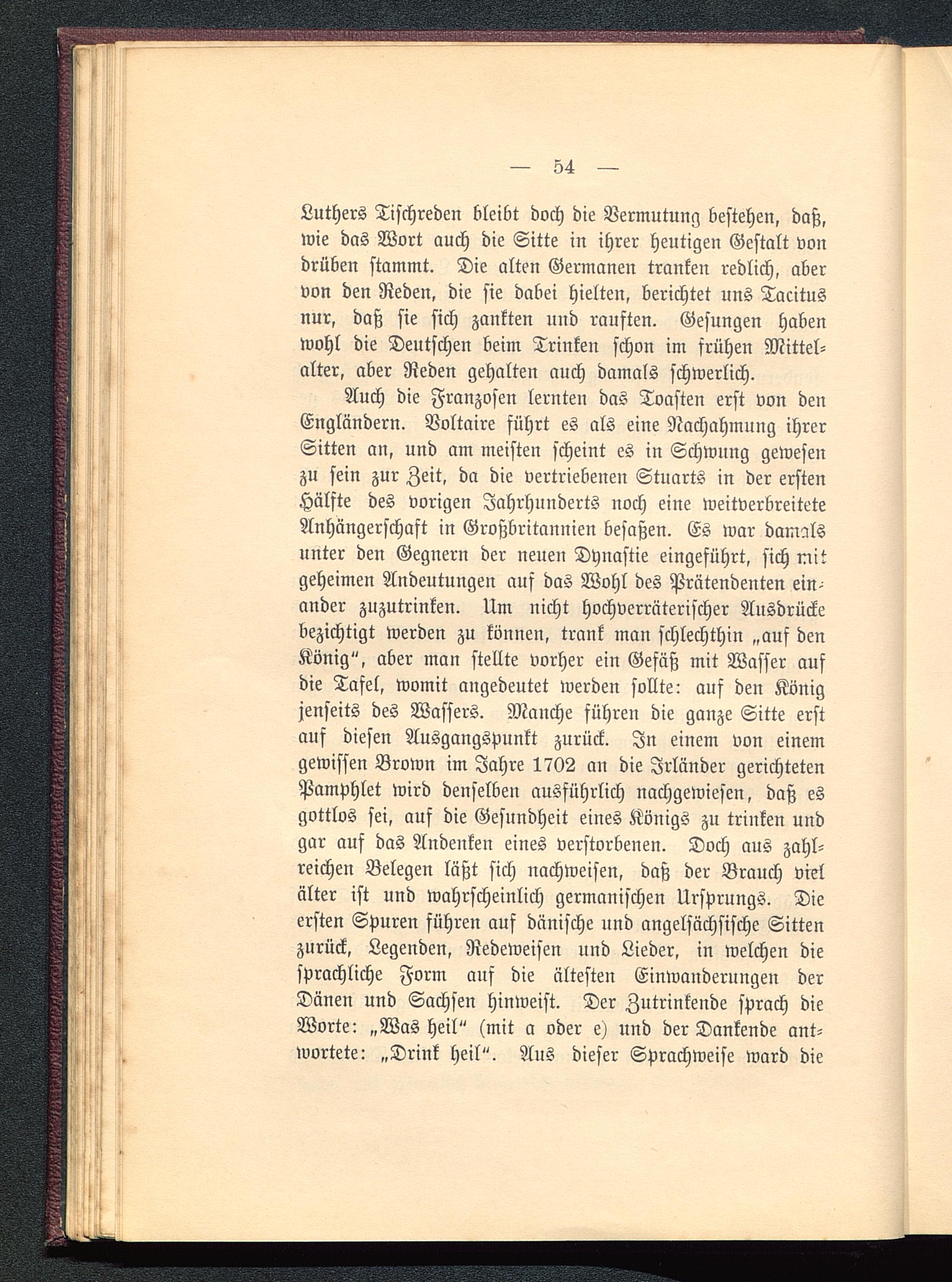 Auch die Franzosen lernten das Toasten erst von denEngländern. Voltaire führt es als eine Nachahmung ihrerSitten an, und am meisten scheint es in Schwung gewesenzu sein zur Zeit, da die vertriebenen Stuarts in der erstenHälfte des vorigen Jahrhunderts noch eine weitverbreiteteAnhängerschaft in Großbritannien besaßen. Es war damalsunter den Gegnern der neuen Dynastie eingeführt, sich mitgeheimen Andeutungen auf das Wohl des Prätendenten ein-ander zuzutrinken. Um nicht hochverräterischer Ausdrückebezichtigt werden zu können, trank man schlechthin „auf denKönig", aber man stellte vorher ein Gefäß mit Wasfer aufdie Tafel, womit angedeutet werden sollte: auf den Königjenseits des Wassers. Manche führen die ganze Sitte erstauf diesen Ausgangspunkt zurück. In einem von einemgewissen Brown im Jahre 1702 an die Jrländer gerichtetenPamphlet wird denselben ausführlich nachgewiesen, daß esgottlos sei, auf die Gesundheit eines Königs zu trinken undgar auf das Andenken eines verstorbenen. Doch aus zahl-reichen Belegen läßt sich nachweisen, daß der Brauch vielälter ist und wahrscheinlich germanischen Ursprungs. Dieersten Spuren führen auf dänische und angelsächsische Sittenzurück, Legenden, Redeweisen und Lieder, in welchen diesprachliche Form auf die ältesten Einwanderungen derDänen und Sachsen hinweist. Der Zutrinkende sprach dieWorte: „Was heil" (mit a oder e) und der Dankende ant-wortete: „Drink heil". Aus dieser Sprachweise ward die