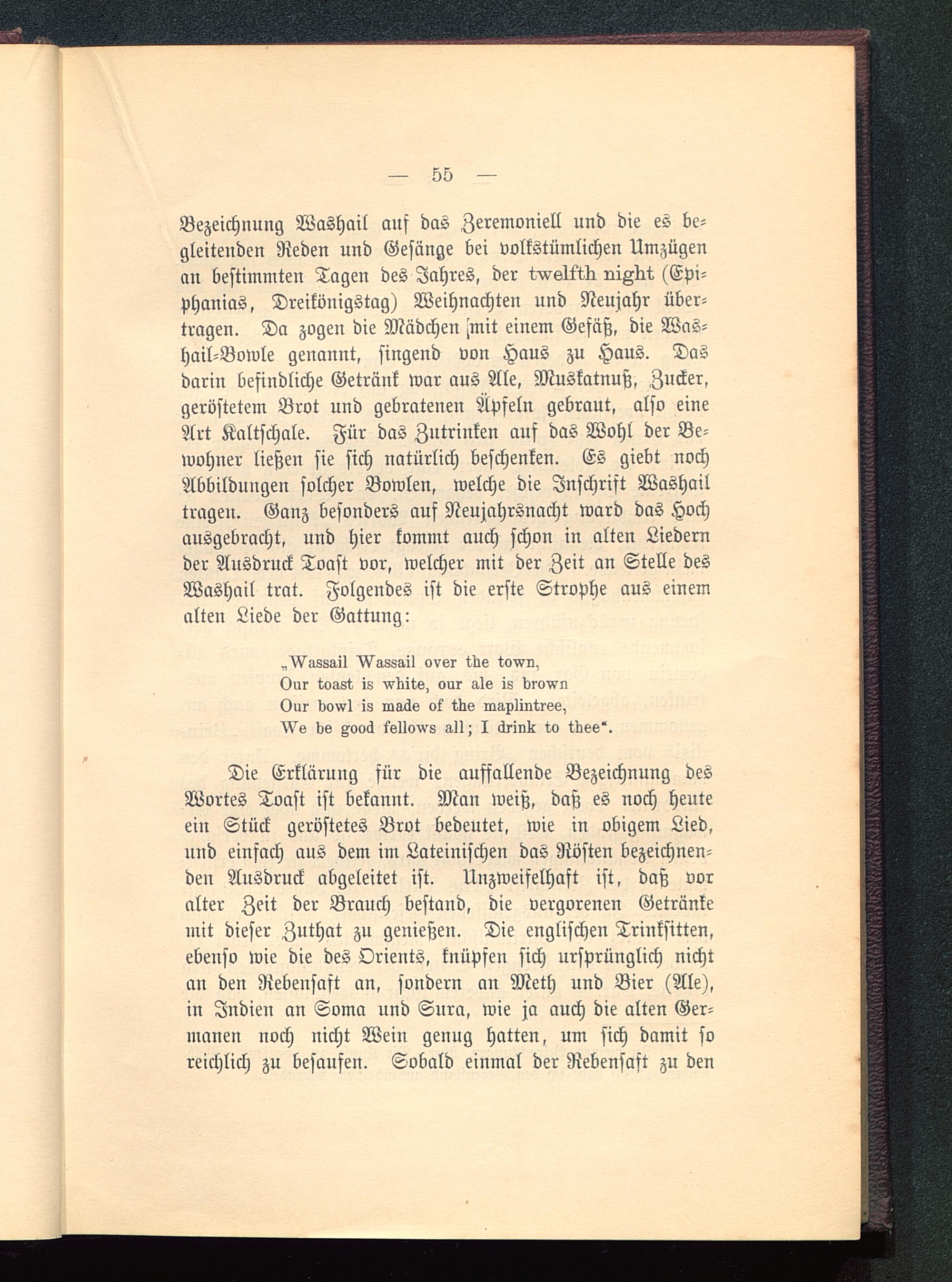 Bezeichnung Washail auf das Zeremoniell und die es be-gleitenden Reden und Gesänge bei volkstümlichen Umzügenan bestimmten Tagen des Jahres, der t^sMti niZtit (Epi-phanias, Dreikönigstag) Weihnachten und Neujahr über-tragen. Da zogen die Mädchen Mt einem Gefäß, die Was-Hail-Bowle genannt, singend von Haus zu Haus. Dasdarin befindliche Getränk war aus Ale, Muskatnuß, Zucker,geröstetem Brot und gebratenen Äpfeln gebraut, also eineArt Kaltschale. Für das Zutrinken auf das Wohl der Be-wohner ließen sie sich natürlich beschenken. Es giebt nochAbbildungen solcher Bowlen, welche die Inschrift Washailtragen. Ganz besonders auf Neujahrsnacht ward das Hochausgebracht, und hier kommt auch schon in alten Liedernder Ausdruck Toast vor, welcher mit der Zeit an Stelle desWashail trat. Folgendes ist die erste Strophe aus einemalten Liede der Gattung: