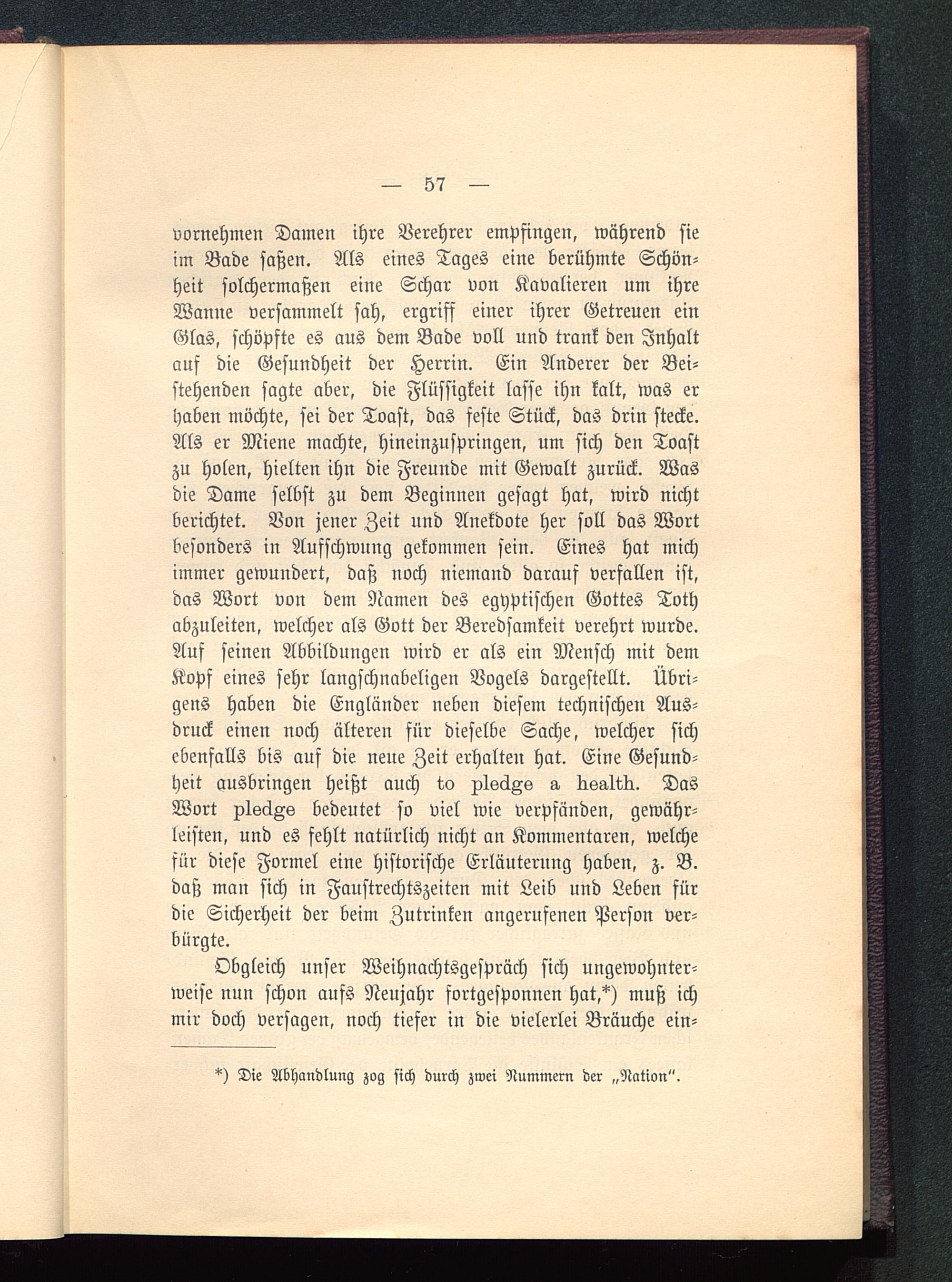 vornehmen Damen ihre Verehrer empfingen, während sieim Bade saßen. Als eines Tages eine berühmte Schön-heit solchermaßen eine Schar von Kavalieren um ihreWanne versammelt sah, ergriff einer ihrer Getreuen einGlas, schöpfte es aus dem Bade voll und trank den Inhaltaus die Gesundheit der Herrin. Ein Anderer der Be-stehenden sagte aber, die Flüssigkeit lasse ihn kalt, was erhaben möchte, sei der Toast, das seste Stück, das drin stecke.Als er Miene machte, hineinzuspringen, um sich den Toastzu holen, hielten ihn die Freunde mit Gewalt zurück. Wasdie Dame selbst zu dem Beginnen gesagt hat, wird nichtberichtet. Von jener Zeit und Anekdote her soll das Wortbesonders in Aufschwung gekommen sein. Eines hat michimmer gewundert, daß noch niemand darauf verfallen ist,das Wort von dem Namen des egyptischen Gottes Tothabzuleiten, welcher als Gott der Beredsamkeit verehrt wurde.Auf seinen Abbildungen wird er als ein Mensch mit demKopf eines sehr langschnabeligen Vogels dargestellt. Übri-gens haben die Engländer neben diesem technischen Aus-druck einen noch älteren für dieselbe Sache, welcher sichebenfalls bis auf die neue Zeit erhalte» hat. Eine Gesund-heit ausbringen heißt auch to xlsdZs a Iisaltd. DasWort pleäAs bedeutet so viel wie verpfänden, gewähr-leisten, und es fehlt natürlich nicht au Kommentaren, welchefür diese Formel eine historische Erläuterung haben, z. B.daß man sich in Faustrechtszeiten mit Leib und Leben fürdie Sicherheit der beim Zutrinken angerufenen Person ver-bürgte.