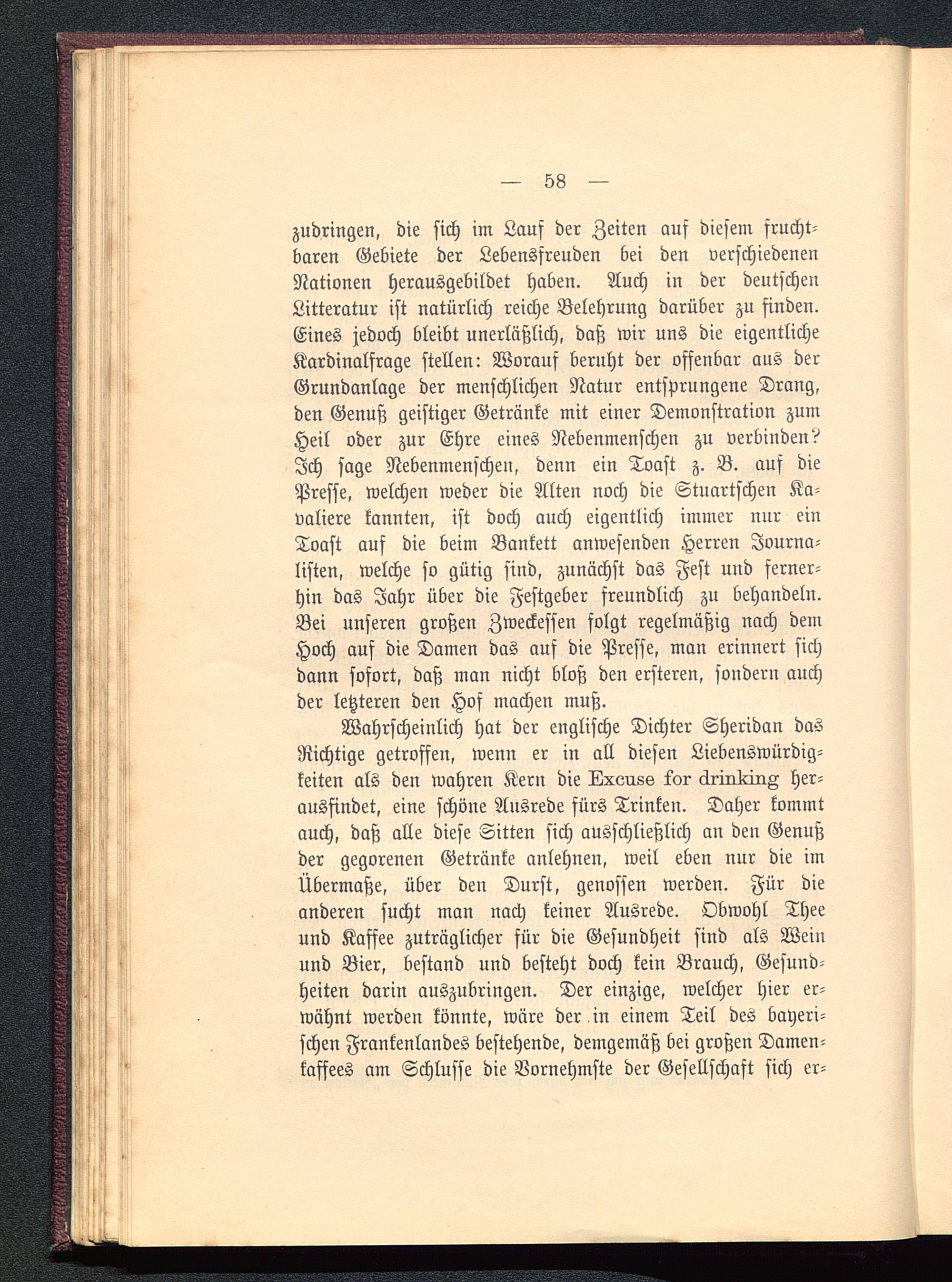 Wahrscheinlich hat der englische Dichter Sheridan dasRichtige getroffen, wenn er in all diesen Liebenswürdig-keiten als den wahren Kern die Uxczuss Lor drin1?ir>Z her-ausfindet, eine schöne Ausrede fürs Trinken. Daher kommtauch, daß alle diese Sitten sich ausschließlich an den Genußder gegorenen Getränke anlehnen, weil eben nur die imÜbermaße, über den Durst, genossen werden. Für dieanderen sucht man nach keiner Ausrede. Obwohl Thee und Kaffee zuträglicher für die Gesundheit sind als Weinund Bier, bestand und besteht doch kein Brauch, Gesund-heiten darin auszubringen. Der einzige, welcher hier er-wähnt werden könnte, wäre der in einem Teil des bayeri-schen Frankenlandes bestehende, demgemäß bei großen Damen-kaffees am Schlüsse die Vornehmste der Gesellschaft sich er-