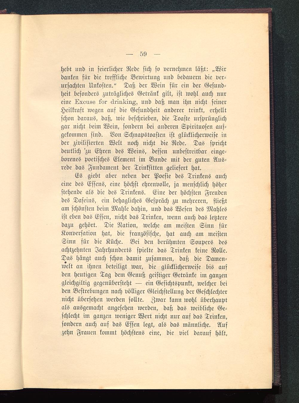 Es giebt aber neben der Poesie des Trinkens aucheine des Essens, eine höchst ehrenvolle, ja menschlich höherstehende als die des Trinkens. Eine der höchsten Freudeudes Daseius, ein behagliches Gespräch zu mehreren, fließtam schönsten beim Mahle dahin, und das Wesen des Mahlesist eben das Essen, nicht das Trinken, wenn auch das letzteredazu gehört. Die Nation, welche am meisten Sinn fürKonversation hat, die französische, hat auch am meisteuSinn für die Küche. Bei deu berühmten Soupers desachtzehnten Jahrhunderts spielte das Trinken keine Rolle.Das hängt auch schon damit zusammen, daß die Damen-welt an ihnen beteiligt war, die glücklicherweise bis aufden heutige» Tag dem Genuß geistiger Getränke im ganzengleichgiltig gegenübersteht — ein Gesichtspunkt, welcher beiden Bestrebungen nach völliger Gleichstellung der Geschlechternicht übersehen werden sollte. Zwar kann wohl überhauptals ausgemacht angesehen werden, daß das weibliche Ge-schlecht im ganzen weniger Wert nicht nur auf das Trinken,sondern auch auf das Essen legt, als das männliche. Aufzehn Frauen kommt höchstens eine, die viel darauf hält,