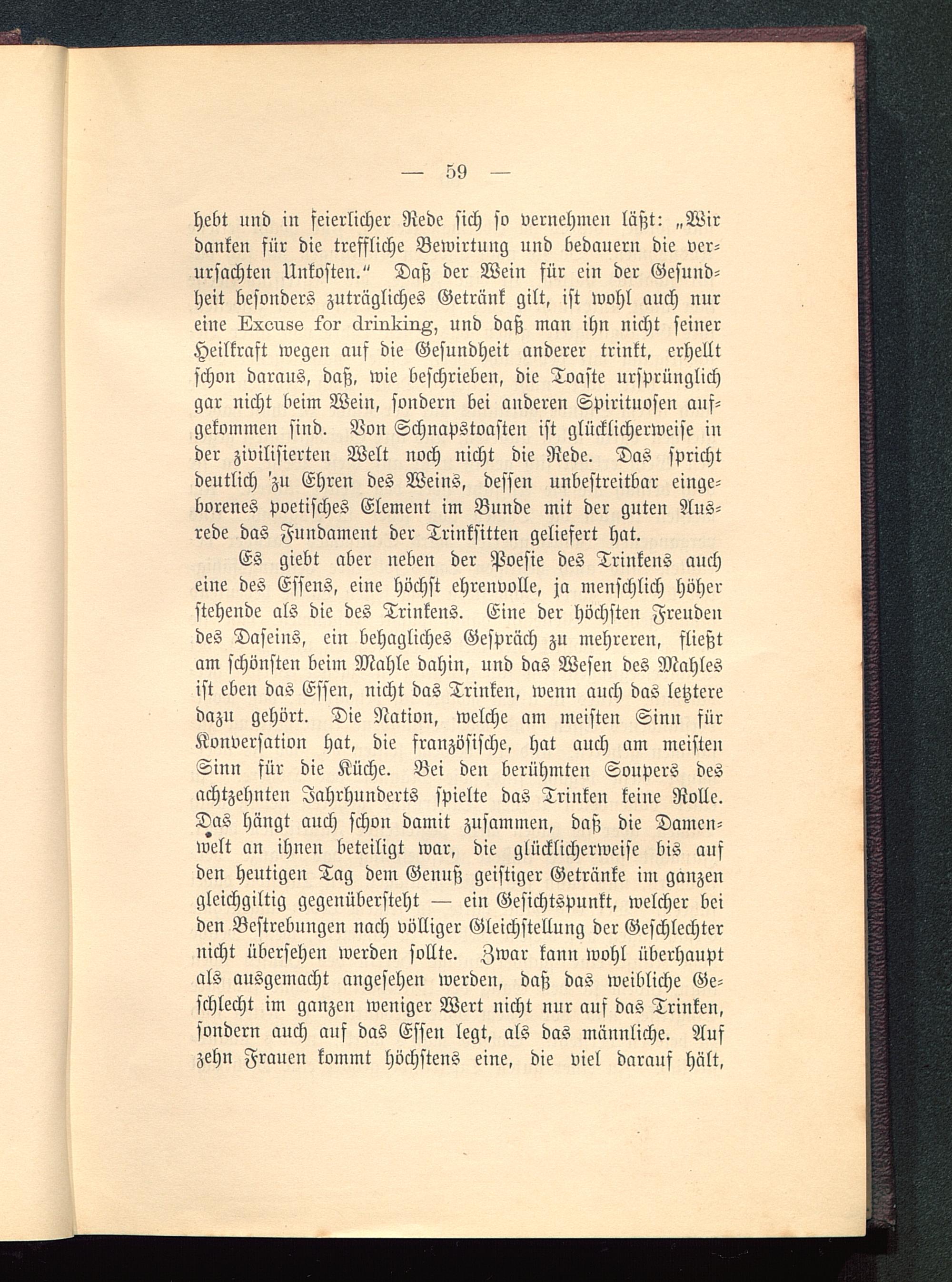 hebt und in feierlicher Rede sich so vernehmen läßt: „Wirdanken für die treffliche Bewirtung und bedauern die ver-ursachte» Unkosten." Daß der Wein für ein der Gesund-heit besonders zuträgliches Getränk gilt, ist Wohl auch nureine ^xouss tor clrinliiriA, und daß man ihn nicht seinerHeilkraft wegen auf die Gesundheit anderer trinkt, erhelltschon daraus, daß, wie beschrieben, die Toaste ursprünglichgar nicht beim Wein, sondern bei anderen Spiritussen auf-gekommen sind. Von Schnapstoasten ist glücklicherweise inder zivilisierten Welt noch nicht die Rede. Das sprichtdeutlich 'zu Ehren des Weins, dessen unbestreitbar einge-borenes poetisches Element im Bnnde mit der guten Aus-rede das Fundament der Trinksitten geliefert hat.