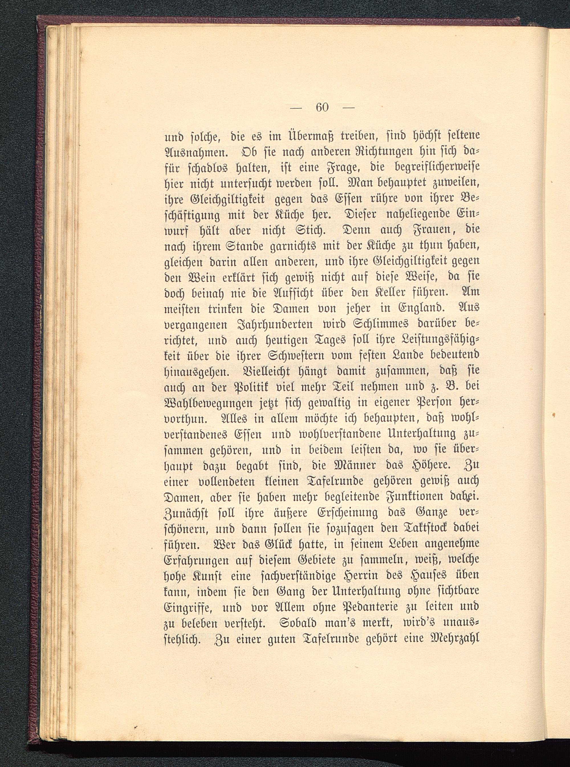 und solche, die es im Übermaß treiben, sind höchst selteneAusnahmen. Ob sie nach anderen Richtungen hin sich da-für schadlos halten, ist eine Frage, die begreiflicherweisehier nicht untersucht werden soll. Man behauptet zuweilen,ihre Gleichgiltigkeit gegen das Essen rühre von ihrer Be-schäftigung mit der Küche her. Dieser naheliegende Ein-wurf hält aber nicht Stich. Denn auch Frauen, dienach ihrem Stande garnichts mit der Küche zu thun haben,gleichen darin allen anderen, und ihre Gleichgiltigkeit gegenden Wein erklärt sich gewiß nicht auf diese Weise, da siedoch beinah nie die Aufsicht über den Keller führen. Ammeisten trinken die Damen von jeher in England . Ausvergangenen Jahrhunderten wird Schlimmes darüber be-richtet, und auch heutigen Tages soll ihre Leistungsfähig-keit über die ihrer Schwestern vom festen Lande bedeutendhinausgehen. Vielleicht hängt damit zusammen, daß sieauch an der Politik viel mehr Teil nehmen und z. B. beiWahlbewegungen jetzt sich gewaltig in eigener Person her-vorthun. Alles in allem möchte ich behaupten, daß wohl-verstandenes Essen und wohlverstandene Unterhaltung zu-sammen gehören, und in beidem leisten da, wo sie über-haupt dazu begabt sind, die Männer das Höhere. Zueiner vollendeten kleinen Tafelrunde gehören gewiß auchDamen, aber sie haben mehr begleitende Funktionen dab^i.Zunächst soll ihre äußere Erscheinung das Ganze ver-schönern, und dann sollen sie sozusagen den Taktstock dabeiführen. Wer das Glück hatte, in feinem Leben angenehmeErfahrungen auf diesem Gebiete zu sammeln, weiß, welchehohe Kunst eine sachverständige Herrin des Hauses übenkann, indem sie den Gang der Unterhaltung ohne sichtbareEingriffe, und vor Allem ohne Pedanterie zu leiten undzu belebeu versteht. Sobald man's merkt, wird's unaus-stehlich. Zu einer guten Tafelrunde gehört eine Mehrzahl