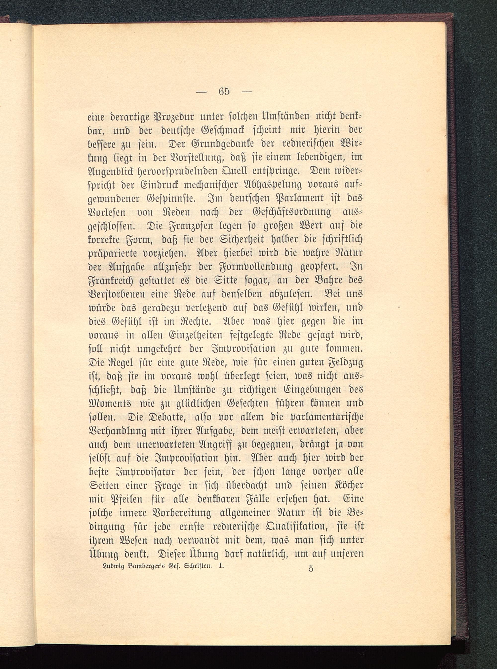eine derartige Prozedur unter solchen Umständen nicht denk-bar, und der deutsche Geschmack scheint mir hierin derbessere zu sein. Der Grundgedanke der rednerischen Wir-kung liegt in der Vorstellung, daß sie einem lebendigen, imAugenblick hervorsprudelnden Quell entspringe. Dem wider-spricht der Eindruck mechanischer Abhaspelung voraus auf-gewundener Gespinnste. Im deutschen Parlament ist dasVorlesen von Reden nach der Geschäftsordnung aus-geschlossen. Die Franzosen legen so großen Wert auf diekorrekte Form, daß sie der Sicherheit halber die schriftlichpräparierte vorziehen. Aber hierbei wird die wahre Naturder Aufgabe allzusehr der Formvollendung geopfert. InFrankreich gestattet es die Sitte sogar, an der Bahre desVerstorbenen eine Rede auf denselben abzulesen. Bei unswürde das geradezu verletzend auf das Gefühl wirken, unddies Gefühl ist im Rechte. Aber was hier gegen die imvoraus in allen Einzelheiten festgelegte Rede gesagt wird,soll nicht umgekehrt der Improvisation zu gute kommen.Die Regel für eine gute Rede, wie für einen guten Feldzugist, daß sie im voraus wohl überlegt seien, was nicht aus-schließt, daß die Umstände zu richtigen Eingebungen desMoments wie zu glücklichen Gefechten führen können undsollen. Die Debatte, also vor allem die parlamentarischeVerhandlung mit ihrer Aufgabe, dem meist erwarteten, aberauch dem unerwarteten Angriff zu begegnen, drängt ja vonselbst auf die Improvisation hin. Aber auch hier wird derbeste Improvisator der sein, der schon lange vorher alleSeiten einer Frage in sich überdacht und seinen Köchermit Pfeilen für alle denkbaren Fälle ersehen hat. Einesolche innere Vorbereitung allgemeiner Natur ist die Be-dingung für jede ernste rednerische Qualifikation, sie istihrem Wesen nach verwandt mit dem, was man sich unterÜbung denkt. Dieser Übung darf natürlich, um auf unseren