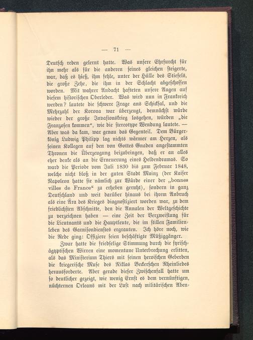 Deutsch reden gelernt hatte. Was unsere Ehrfurcht fürihn mehr als für die anderen seines gleichen steigerte,war, daß es hieß, ihm fehle, unter der Hülle des Stiefels,die große Zehe, die ihm in der Schlacht abgeschossenworden. Mit wahrer Andacht hafteten unsere Augen aufdiesem historischen Oberleder. Was wird nun in Frankreich werden? lautete die schwere Frage ans Schicksal, und dieMehrzahl der Korona war überzeugt, demnächst würdewieder der große Invasionskrieg losgehen, würden „dieFranzosen kommen", wie die stereotype Wendung lautete. —Aber was da kam, war genau das Gegenteil. Dem Bürger-kvnig Ludwig Philipp lag nichts wärmer am Herzen, alsseinen Kollegen auf den von Gottes Gnaden angestammtenThronen die Überzeugung beizubringen, daß er an alleseher denke als an die Erneuerung eines Heldendramas. Soward die Periode vom Juli 1830 bis zum Februar 1848,welche nicht bloß in der guten Stadt Mainz (der KaiserNapoleon hatte sie nämlich zur Würde einer der „doniissvillsL äs Kranes" zu erheben geruht), sondern in ganzDeutschland und weit darüber hinaus bei ihrem Anbruchals eine Ära des Krieges diagnostiziert worden war, zu demfriedlichsten Abschnitte, den die Annalen der Weltgeschichtezu verzeichnen haben — eine Zeit der Verzweiflung fürdie Lieutnants und die Hauptleute, die im stilleu Familien-leben des Garnisondienstes ergrauten. Ich höre noch, wiedie Rede ging: Offiziere seien beschäftigte Müßiggänger.