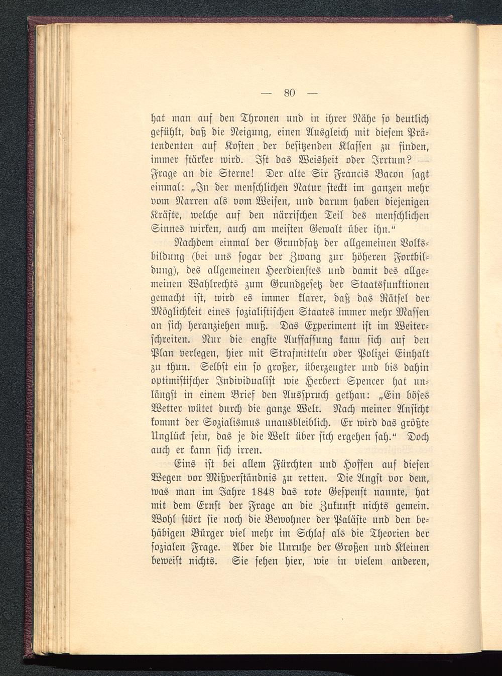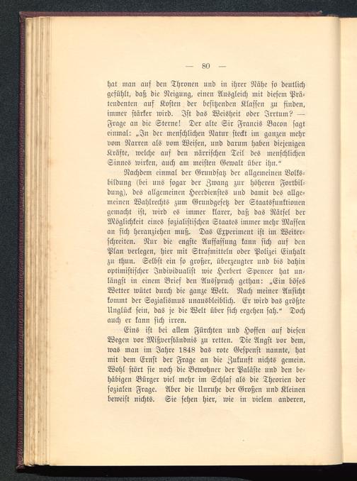 Nachdem einmal der Grundsatz der allgemeinen Volks-bildung (bei uns sogar der Zwang zur höheren Fortbil-dung), des allgemeinen Heerdienstes und damit des allge-meinen Wahlrechts zum Grundgesetz der Staatsfunktioneugemacht ist, wird es immer klarer, daß das Rätsel derMöglichkeit eines sozialistischen Staates immer mehr Massenan sich heranziehen muß. Das Experiment ist im Weiter-schreiten. Nur die engste Ausfassung kann sich auf denPlan verlegen, hier mit Strafmitteln oder Polizei Einhaltzu thun. Selbst ein so großer, überzeugter und bis dahinoptimistischer Individualist wie Herbert Spencer hat un-längst in einem Brief den Ausspruch gethan: „Ein bösesWetter wütet durch die ganze Welt. Nach meiner Ansichtkommt der Sozialismus unausbleiblich. Er wird das größteUnglück sein, das je die Welt über sich ergehen sah." Dochauch er kann sich irren.
