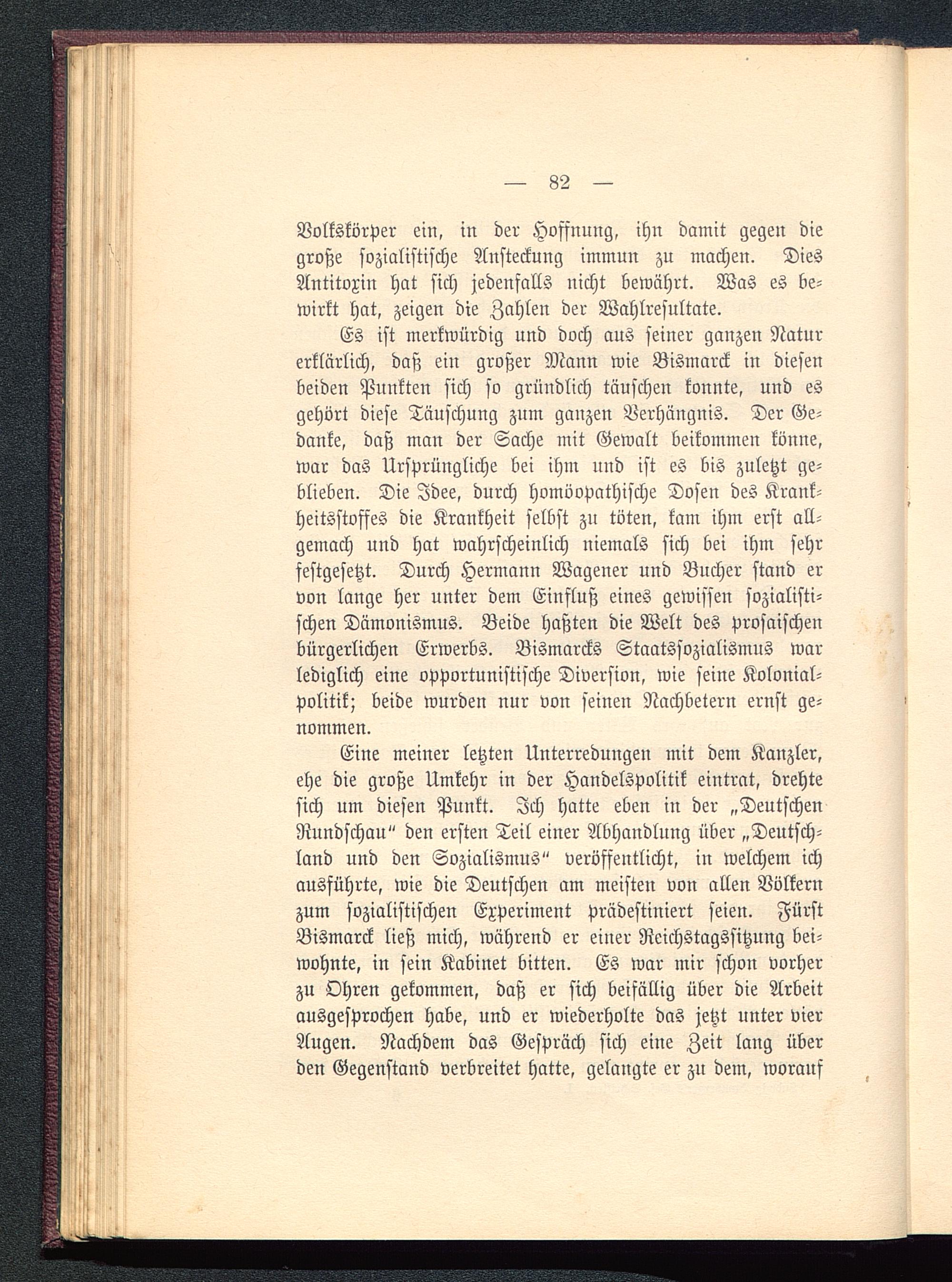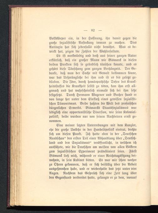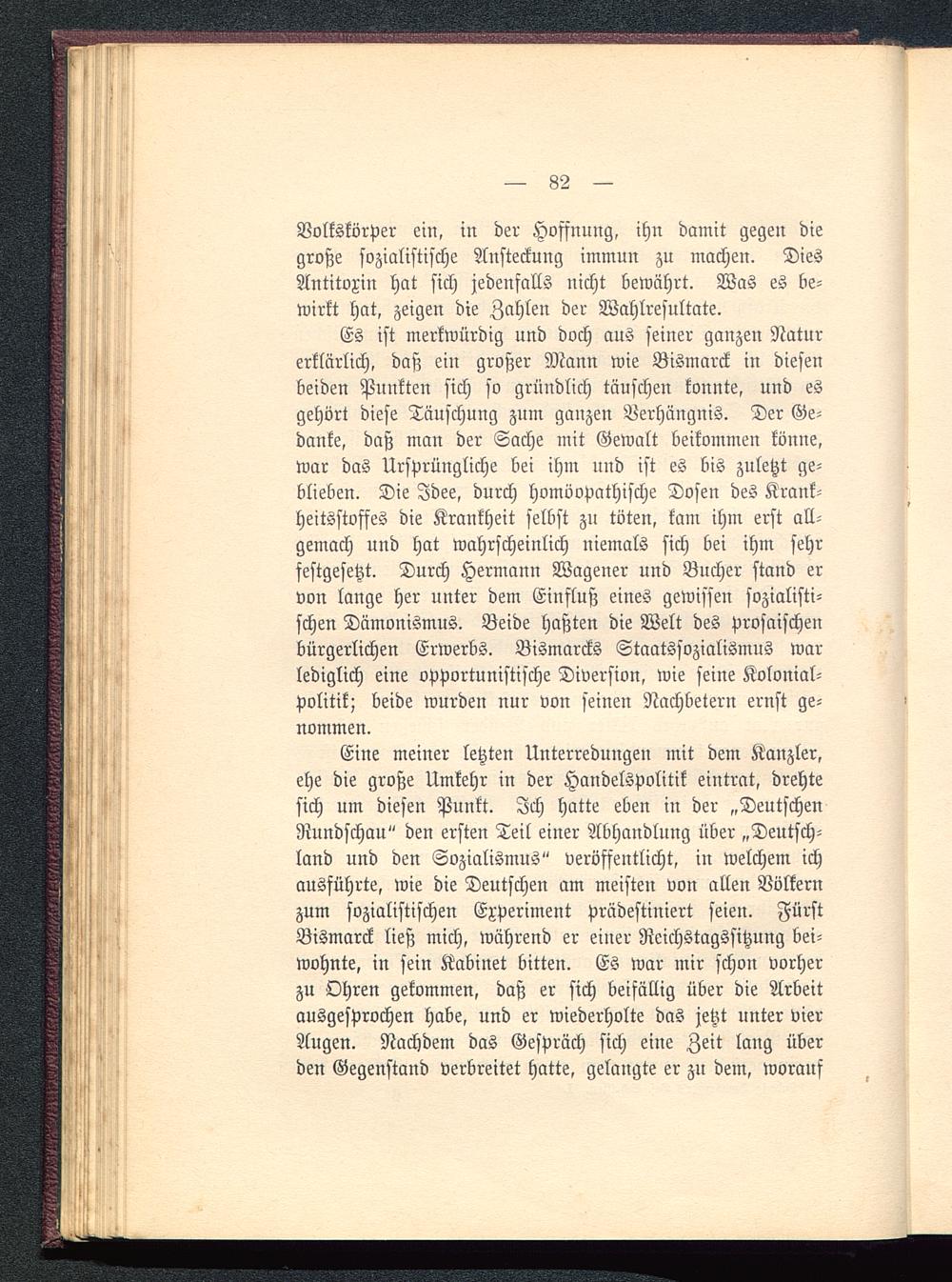Eine meiner letzten Unterredungen mit dem Kanzler,ehe die große Umkehr in der Handelspolitik eintrat, drehtesich um diesen Punkt. Ich hatte eben in der „DeutschenRundschau" den ersten Teil einer Abhandlung über „Deutsch-land und den Sozialismus" veröffentlicht, in welchem ichausführte, wie die Deutschen am meisten von allen Völkernzum sozialistischen Experiment prädestiniert seien. FürstBismarck ließ mich, während er einer Reichstagssitzung bei-wohnte, in sein Kabinet bitten. Es war mir schon vorherzu Ohren gekommen, daß er sich beifällig über die Arbeitausgesprochen habe, und er wiederholte das jetzt unter vierAugen. Nachdem das Gespräch sich eine Zeit lang überden Gegenstand verbreitet hatte, gelangte er zu dem, worauf