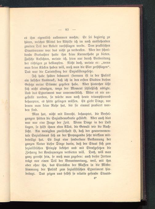 es ihm eigentlich ankommen mochte. Er sei begierig zuhören, welches Mittel der Abhilfe ich im noch ausstehendenzweiten Teil der Arbeit vorschlagen werde. Dem praktischenStaatsmanne war das nicht zu verdenken. Aber der schrei-bende Beobachter hatte ihm keine Kurmethode zu bieten.Falsche Ansichten, meinte ich, seien nur durch Verbreitungder richtigen zu bekämpfen. Nicht doch, meinte er: „wennman keine Kücken haben will, muß man die Eier zerschlagen".Das war die Quintessenz der Sozialistengesetze.
