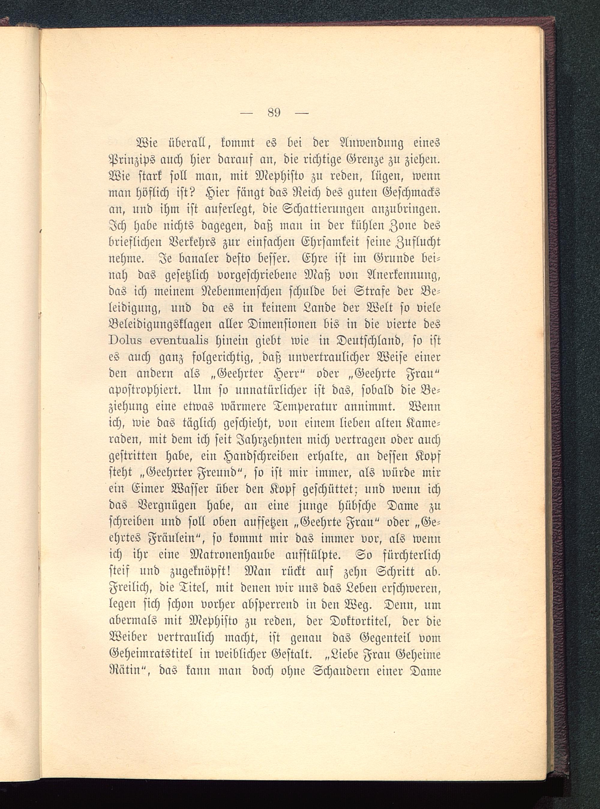 Wie überall, kommt es bei der Anwendung einesPrinzips auch hier darauf an, die richtige Grenze zu ziehen.Wie stark soll man, mit Mephisto zu reden, lügen, wennman höflich ist? Hier fängt das Reich des guten Geschmacksan, und ihm ist auferlegt, die Schattierungen anzubringen.Ich habe nichts dagegen, daß man in der kühlen Zone desbrieflichen Verkehrs zur einfachen Ehrsamkeit seine Zufluchtnehme. Je banaler desto besser. Ehre ist im Grunde bei-nah das gesetzlich vorgeschriebene Maß von Anerkennung,das ich meinem Nebenmenschen schulde bei Strafe der Be-leidigung, und da es in keinem Lande der Welt so vieleBeleidigungsklagen aller Dimensionen bis in die vierte desvolrls svsirtualis hinein giebt wie in Deutschland , so istes auch ganz folgerichtig, daß nnvertraulicher Weise einerden andern als „Geehrter Herr" oder „Geehrte Frau"apostrophiert. Um so unnatürlicher ist das, sobald die Be-ziehung eine etwas wärmere Temperatur annimmt. Wennich, wie das täglich geschieht, von einem lieben alten Kame-raden, mit dem ich seit Jahrzehnten mich vertragen oder auchgestritten habe, ein Handschreiben erhalte, an dessen Kopfsteht „Geehrter Freund", so ist mir immer, als würde mirein Eimer Wasser über den Kopf geschüttet: und wenn ichdas Vergnügen habe, an eine junge hübsche Dame zuschreiben und soll oben aufsetzen „Geehrte Frau" oder „Ge-ehrtes Fräulein", so kommt mir das immer vor, als wennich ihr eine Matronenhaube aufstülpte. So fürchterlichsteif uud zugeknöpft! Man rückt auf zehn Schritt ab.Freilich, die Titel, mit denen wir uns das Leben erschweren,legen sich schon vorher absperrend in den Weg. Denn, umabermals mit Mephisto zu reden, der Doktortitel, der dieWeiber vertraulich macht, ist genau das Gegenteil vomGeheimratstitel in weiblicher Gestalt. „Liebe Fran GeheimeRätin", das kann man doch ohne Schauder» einer Dame
