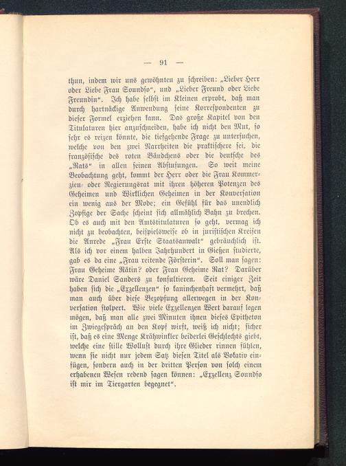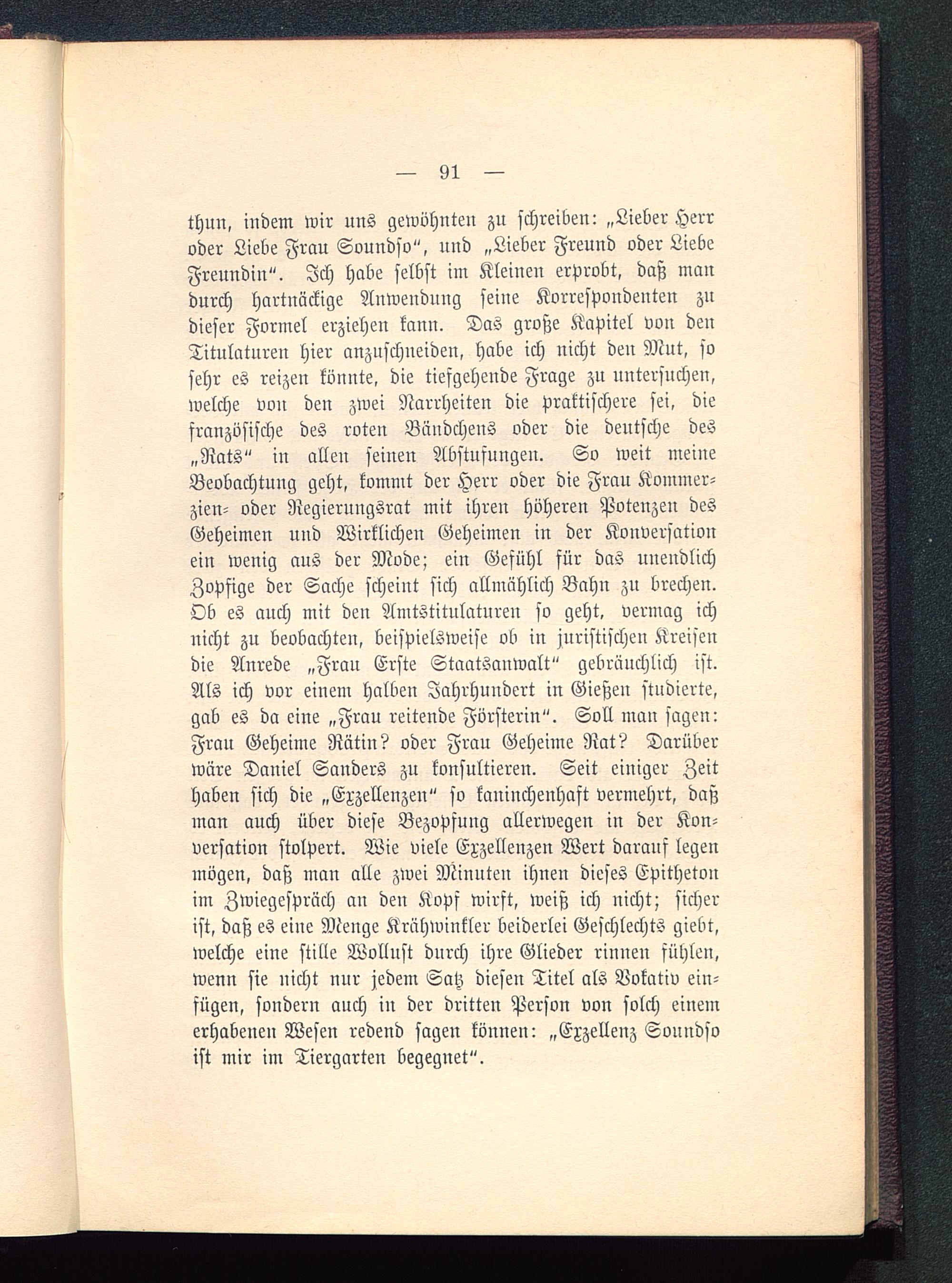 thun, indem wir uns gewöhnten zn schreiben: „Lieber Herroder Liebe Frau Soundso", nnd „Lieber Freund oder LiebeFreundin". Ich habe selbst im Kleinen erprobt, daß mandurch hartnäckige Anwendung seiue Korrespondenten zndieser Formel erziehen kann. Das große Kapitel von denTitulaturen hier anzuschneiden, habe ich nicht den Mnt, sosehr es reizen könnte, die tiefgehende Frage zu untersuchen,welche von den zwei Narrheiten die praktischere sei, diefranzösische des roten Bändchens oder die deutsche des„Rats" in allen seinen Abstufungen. So weit meineBeobachtung geht, kommt der Herr oder die Frau Kommer-zien- oder Negierungsrat mit ihren höheren Potenzen desGeheimen und Wirklichen Geheimen in der Konversationein wenig aus der Mode; ein Gefühl für das unendlichZopfige der Sache scheint sich allmählich Bahn zu brechen.Ob es auch mit den Amtstitulatureu so geht, vermag ichnicht zu beobachten, beispielsweise ob in juristischen Kreisendie Anrede „Frau Erste Staatsauwalt" gebräuchlich ist.Als ich vor einem halben Jahrhundert in Gießen stndierte,gab es da eine „Frau reitende Försterin". Soll man sagen:Frau Geheime Rätin? oder Frau Geheime Rat? Darüberwäre Daniel Sanders zu konsultieren. Seit einiger Zeithaben sich die „Exzellenzen" so kaninchenhaft vermehrt, daßman auch über diese Bezopfung allerwegen in der Kon-versation stolpert. Wie viele Exzellenzen Wert darauf legenmögen, daß man alle zwei Minuten ihnen dieses Epithetonim Zwiegespräch an den Kopf wirft, weiß ich nicht; sicherist, daß es eine Menge Krähwinkler beiderlei Geschlechts giebt,welche eine stille Wollust durch ihre Glieder rinuen fühlen,wenn sie nicht nur jedem Satz diesen Titel als Vokativ ein-fügen, sondern auch in der dritten Person von solch einemerhabenen Wesen redend sagen können: „Exzellenz Sonndsoist mir im Tiergarten begegnet".