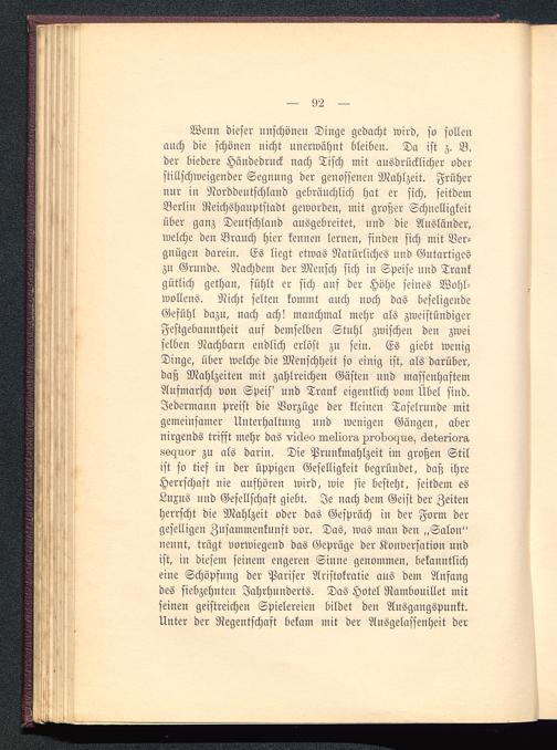 Wenn dieser unschönen Dinge gedacht wird, so sollenauch die schönen nicht unerwähnt bleiben. Da ist z. B.der biedere Händedruck nach Tisch mit ausdrücklicher oderstillschweigender Segnung der genossenen Mahlzeit. Frühernur in Norddentschland gebräuchlich hat er sich, seitdemBerlin Reichshauptstadt geworden, mit großer Schnelligkeitüber ganz Deutschland ausgebreitet, und die Ausländer,welche den Brauch hier kennen lernen, finden sich mit Ver-gnügen darein. Es liegt etwas Natürliches und Gutartigeszu Grunde. Nachdem der Mensch sich in Speise nnd Trankgütlich gethan, fühlt er sich auf der Höhe seines Wohl-wollens. Nicht selten kommt auch noch das beseligendeGefühl dazu, nach ach! manchmal mehr als zweistündigerFestgebanntheit auf demselben Stuhl zwischen den zweiselben Nachbarn endlich erlöst zu sein. Es giebt wenigDinge, über welche die Menschheit so einig ist, als darüber,daß Mahlzeiten mit zahlreichen Gästen und massenhaftemAufmarsch von Speis' und Trank eigentlich vom Übel sind.Jedermann preist die Vorzüge der kleinen Tafelrunde mitgemeinsamer Unterhaltung uud wenigen Gängen, abernirgends trifft mehr das vickso msliors, xrodvczus, ckstsrioi-g,ssquor zu als darin. Die Pruukmahlzeit im großen Stilist so tief in der üppigen Geselligkeit begründet, daß ihreHerrschaft nie aufhören wird, wie sie besteht, seitdem esLuxus und Gesellschaft giebt. Je nach dem Geist der Zeitenherrscht die Mahlzeit oder das Gespräch in der Form dergeselligen Zusammenkunft vor. Das, was man den „Salon"nennt, trägt vorwiegend das Gepräge der Konversation undist, in diesem seinem engeren Sinne genommen, bekanntlicheine Schöpfung der Pariser Aristokratie aus dem Anfangdes siebzehnten Jahrhunderts. Das Hotel Rambouillet mitseinen geistreichen Spielereien bildet den Ausgangspunkt.Unter der Regentschaft bekam mit der Ausgelassenheit der