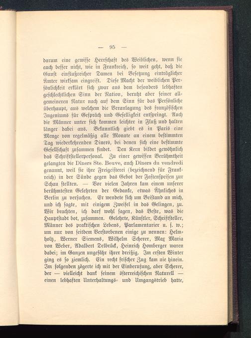 darum eine gewisse Herrschaft des Weiblichen, wenn sieauch besser nicht, wie in Frankreich , so weit geht, daß dieGnnst einflußreicher Dameu bei Besetzung einträglicherÄmter wirksam eingreift. Diese Macht der weiblichen Per-sönlichkeit erklärt sich zwar ans dem besonders lebhaftengeschlechtlichen Sinn der Nation, bernht aber seiner all-gemeineren Natur uach auf dem Sinn für das Persönlicheüberhaupt, aus welchem die Veranlagung des französischenIngeniums für Gespräch und Geselligkeit entspringt. Auchdie Männer unter sich kommen leichter in Fluß und haltenlänger dabei aus. Bekanntlich giebt es in Paris eineMenge von regelmäßig alle Monate an einem bestimmtenTag wiederkehrenden Diners, bei denen sich eine bestimmteGesellschaft zusammen findet. Den Kern bildet gewöhnlichdas Schriftstellerpersoual. Zu einer gewissen Berühmtheitgelangten die Dürers Lts. Lkirvk, auch Dirisrs clu vsircZrsdigenannt, weil sie ihre Freigeisterei (bezeichnend für Frank-reich ) in der Sünde gegen das Gebot der Fastenspeisen znrSchau stellten. — Vor vielen Jahren kam einem unsererberühmtesten Gelehrten der Gedanke, etwas Ähnliches inBerlin zu versuchen. Er wendete sich um Beistand an mich,und ich sagte, mit einigem Zweifel in das Gelingen, zu.Wir brachten, ich darf wohl sagen, das Beste, was dieHauptstadt bot, zusammen. Gelehrte, Künstler, Schriftsteller,Männer des praktischen Lebens, Parlamentarier u. s. w.;um nur von seitdem Verstorbenen einige zu nennen: Helm-holtz, Werner Siemens, Wilhelm Scherer, Max Mariavon Weber, Adalbert Delbrück, Heinrich Homberger warendabei; im Ganzen ungefähr ihrer dreißig. Im ersten Winterging es so ziemlich. Ein recht frischer Zug kam nie hinein.Im folgenden zögerte ich mit der Einberufung, aber Scherer,der — vielleicht dank seinem österreichischen Naturell —einen lebhaften Unterhaltungs- und Umgangstrieb hatte,