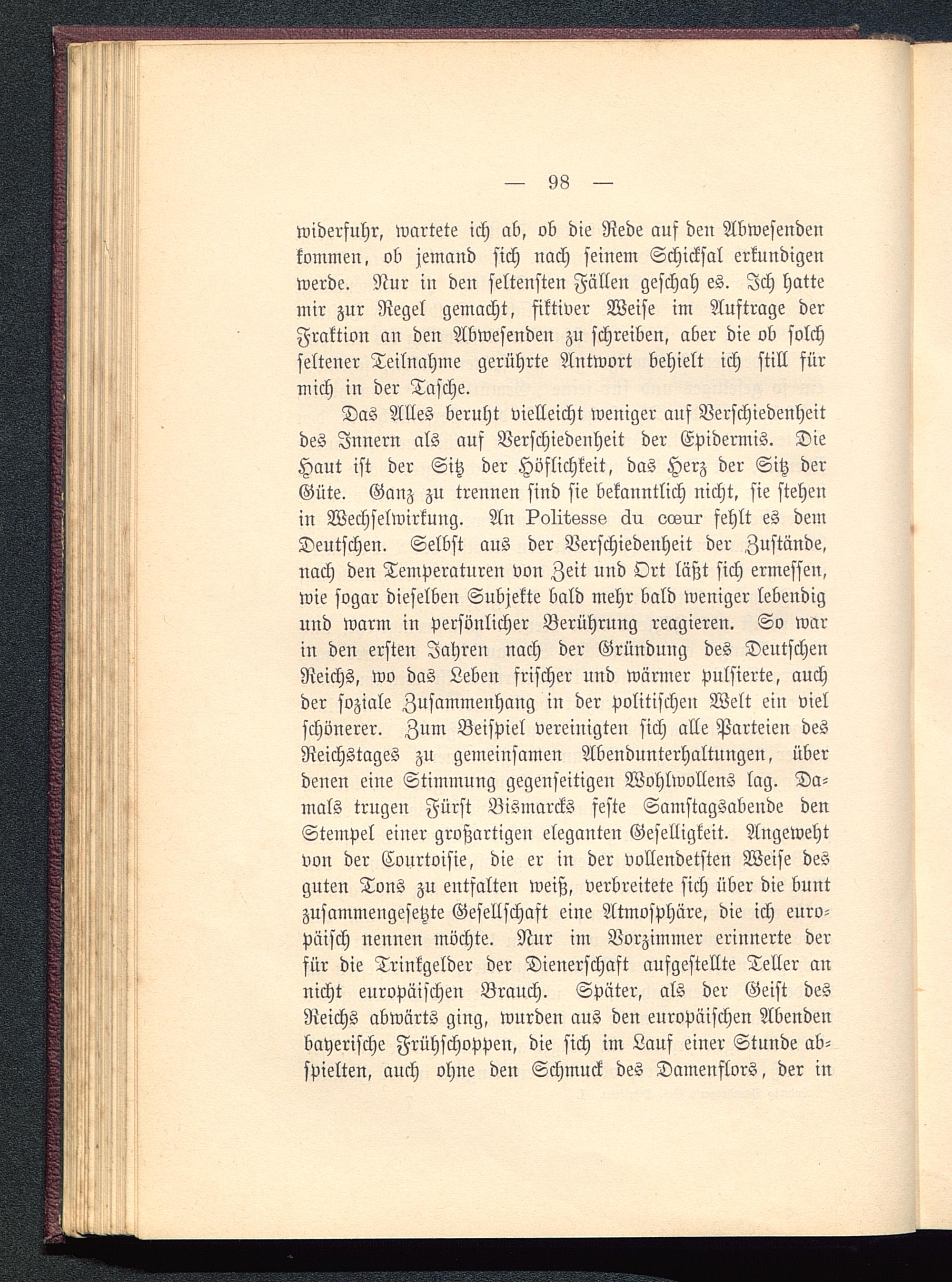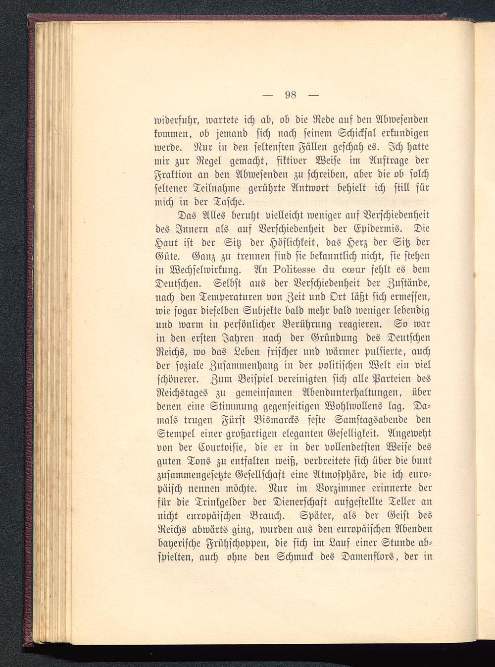 Das Alles beruht vielleicht weniger auf Verschiedenheitdes Innern als auf Verschiedenheit der Epidermis. DieHaut ist der Sitz der Höflichkeit, das Herz der Sitz derGüte. Ganz zu trennen sind sie bekanntlich nicht, sie stehenin Wechselwirkung. An ?o1itssss äu «zosrii- fehlt es demDeutschen. Selbst aus der Verschiedenheit der Zustände,nach den Temperaturen von Zeit und Ort läßt sich ermessen,wie sogar dieselben Subjekte bald mehr bald weniger lebendigund warm in persönlicher Berührung reagieren. So warin den ersten Jahren nach der Gründung des DeutschenReichs, wo das Leben frischer und wärmer pulsierte, auchder soziale Zusammenhang in der politischen Welt ein vielschönerer. Zum Beispiel verewigten sich alle Parteien desReichstages zu gemeinsamen Abendunterhaltungen, überdenen eine Stimmung gegenseitigen Wohlwollens lag. Da-mals trugen Fürst Bismarcks feste Samstagsabende denStempel einer großartigen eleganten Geselligkeit. Angewehtvon der Conrtoisie, die er in der vollendetsten Weise desguten Tons zu entfalten weiß, verbreitete sich über die buntzusammengesetzte Gesellschaft eine Atmosphäre, die ich euro-päisch nennen möchte. Nnr im Vorzimmer erinnerte derfür die Trinkgelder der Dienerschaft aufgestellte Teller annicht europäischen Brauch. Später, als der Geist desReichs abwärts ging, wurden aus den europäischen Abendenbayerische Frühschoppen, die sich im Lauf einer Stunde ab-spielten, auch ohne den Schmuck des Dainenflors, der in