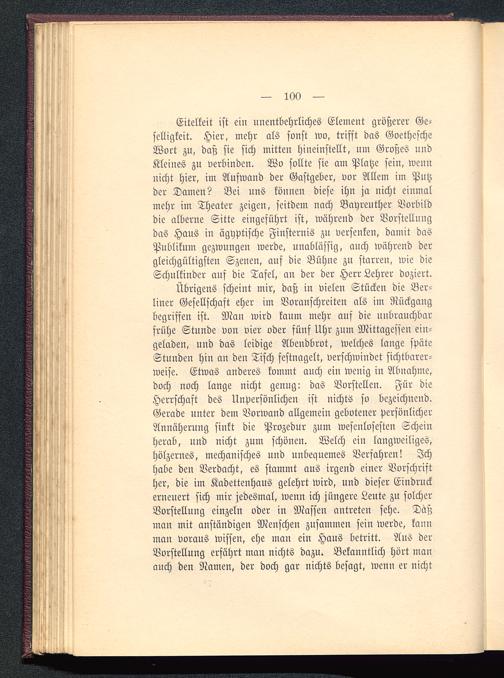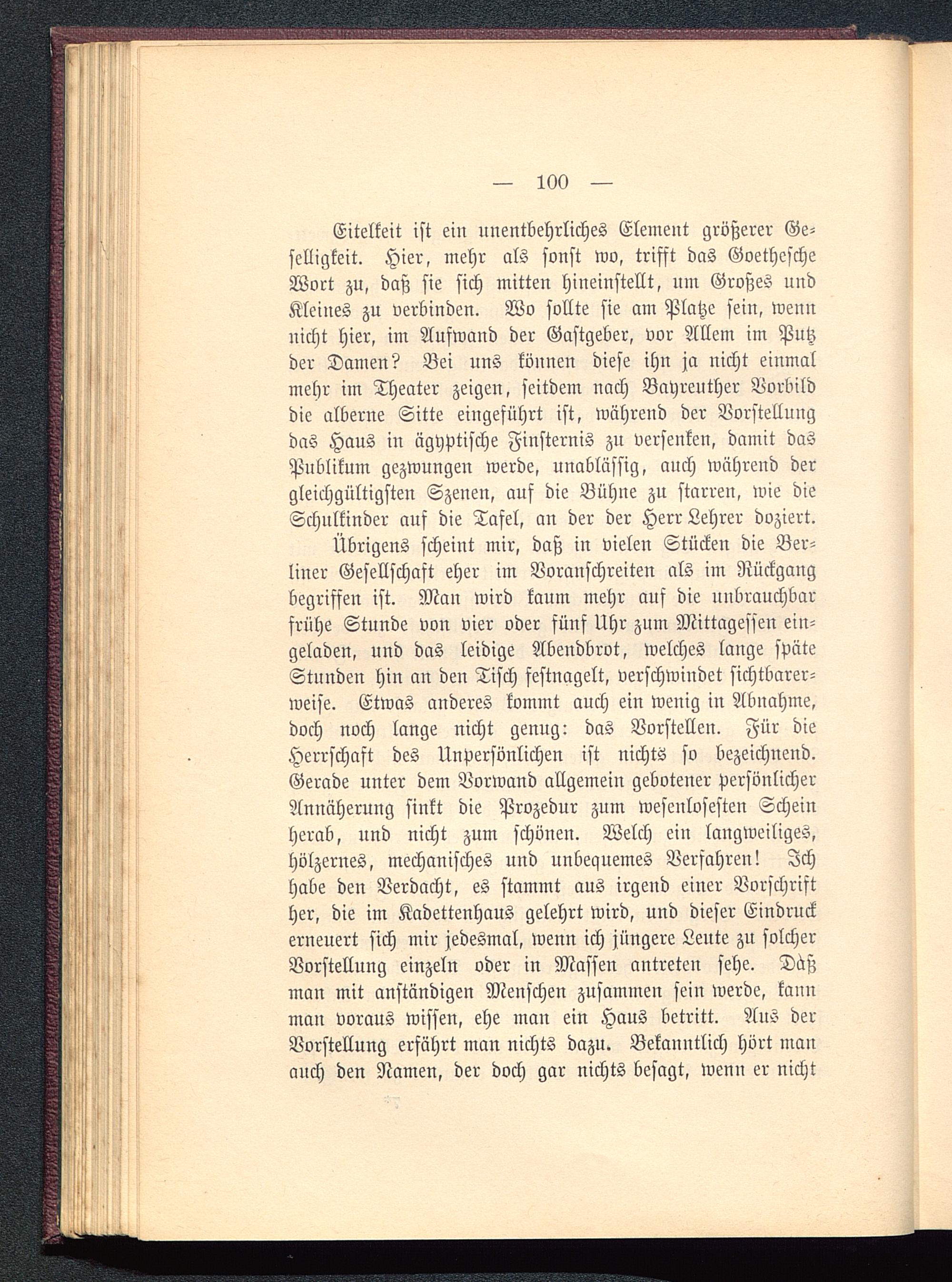 Übrigens scheint mir, daß in vielen Stücken die Ber-liner Gesellschaft eher im Voranschreiten als im Rückgangbegriffen ist. Man wird kaum mehr auf die unbrauchbarfrühe Stunde von vier oder fünf Uhr zum Mittagessen ein-geladen, nnd das leidige Abendbrot, welches lange späteStunden hin an den Tisch festnagelt, verschwindet sichtbarer-weise. Etwas anderes kommt auch ein wenig in Abnahme,doch noch lange nicht genug: das Vorstellen. Für dieHerrschaft des Unpersönlichen ist nichts so bezeichnend.Gerade unter dem Borwand allgemein gebotener persönlicherAnnäherung sinkt die Prozedur zum wesenlosesten Scheinherab, und nicht zum schönen. Welch ein langweiliges,hölzernes, mechanisches und unbequemes Verfahren! Ichhabe den Verdacht, es stammt aus irgend einer Vorschrifther, die im Kadettenhaus gelehrt wird, und dieser Eindruckerneuert sich mir jedesmal, wenn ich jüngere Leute zu solcherVorstellung einzeln oder in Massen antreten sehe. Daßman mit anständigen Menschen zusammen sein werde, kannman voraus wissen, ehe man ein Haus betritt. Aus derVorstellung erfährt man nichts dazu. Bekanntlich hört mauauch den Namen, der doch gar nichts besagt, wenn er nicht