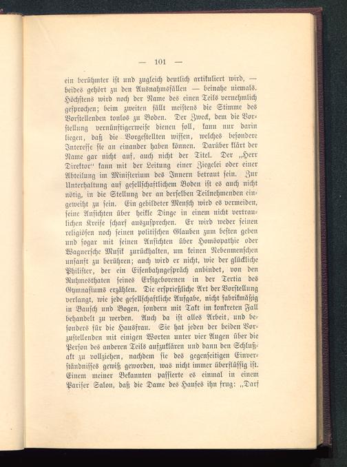 ein berühmter ist und zugleich deutlich artikuliert wird, —beides gehört zu den Ausnahmsfüllen — beinahe niemals.Höchstens wird noch der Name des einen Teils vernehmlichgesprochen; beim zweiten füllt meistens die Stimme desVorstellenden tonlos zu Boden. Der Zweck, dem die Vor-stellung vernünftigerweise dienen soll, kann nur darinliegen, daß die Vorgestellten wissen, welches besondereInteresse sie an einander haben können. Darüber klärt derName gar nicht auf, auch nicht der Titel. Der „HerrDirektor" kann mit der Leitung einer Ziegelei oder einerAbteilung im Ministerium des Innern betraut sein. ZurUnterhaltung auf gesellschaftlichem Boden ist es auch nichtnötig, in die Stellung der an derselben Teilnehmenden ein-geweiht zu sein. Ein gebildeter Mensch wird es vermeiden,seine Ansichten über heikle Dinge in einem nicht vertrau-lichen Kreise scharf auszusprechen. Er wird weder seinenreligiösen noch seinen politischen Glauben zum besten gebenund sogar mit seinen Ansichten über Homöopathie oderWagnersche Musik zurückhalten, um keinen Nebenmeuschenunsanft zu berühren; auch wird er uicht, wie der glücklichePhilister, der ein Eisenbahngespräch anbindet, von denRuhmesthaten seines Erstgeborenen in der Tertia desGymnasiums erzählen. Die ersprießliche Art der Vorstellungverlangt, wie jede gesellschaftliche Aufgabe, nicht fabrikmäßigin Bausch und Bogen, sondern mit Takt im konkreten Fallbehandelt zu werden. Auch da ist alles Arbeit, und be-sonders für die Hausfrau. Sie hat jeden der beiden Vor-zustellenden mit einigen Worten unter vier Augen über diePerson des anderen Teils aufzuklären und dann den Schluß-akt zu vollziehen, nachdem sie des gegenseitigen Einver-ständnisses gewiß geworden, was nicht immer überflüssig ist.Einem meiner Bekannten passierte es einmal in einemPariser Salon , daß die Dame des Hauses ihn frug: ,,Darf