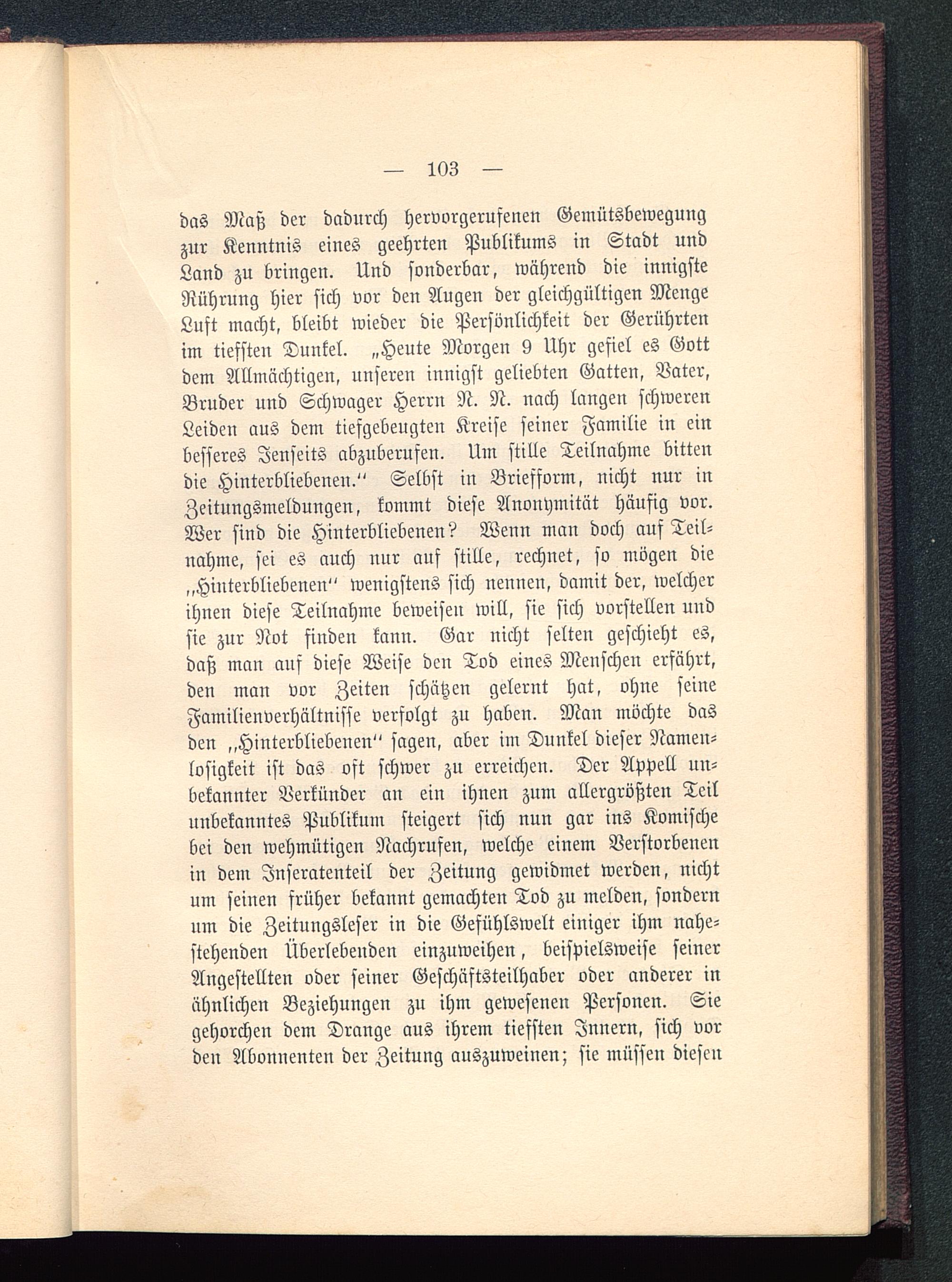 das Maß der dadurch hervorgerufenen Gemütsbewegungzur Kenntnis eines geehrten Publikums in Stadt undLand zu bringen. Und sonderbar, während die innigsteRührung hier sich vor den Augen der gleichgültigen MengeLuft macht, bleibt wieder die Persönlichkeit der Gerührtenim tiefsten Dunkel. „Heute Morgen 9 Uhr gefiel es Gottdem Allmächtigen, unseren innigst geliebten Gatten, Vater,Bruder und Schwager Herrn N. N. nach langen schwerenLeiden aus dem tiefgebeugten Kreise seiner Familie in einbesseres Jenseits abzuberufen. Um stille Teilnahme bittendie Hinterbliebenen." Selbst in Briefform, nicht nur inZeitungsmeldungen, kommt diese Anonymität häufig vor.Wer sind die Hinterbliebenen? Wenn man doch auf Teil-nahme, sei es auch nur auf stille, rechnet, fo mögen die,.Hinterbliebenen" wenigstens sich nennen, damit der, welcherihnen diese Teilnahme beweisen will, sie sich vorstellen uudsie zur Not finden kann. Gar nicht selten geschieht es,daß man auf diese Weise den Tod eines Menschen erfährt,den man vor Zeiten schätzen gelernt hat, ohne seineFamilienverhältnisfe verfolgt zu haben. Man möchte dasden „Hinterbliebenen" sagen, aber im Dunkel dieser Namen-losigkeit ist das oft schwer zu erreichen. Der Appell un-bekannter Berkünder an ein ihnen zum allergrößten Teilunbekanntes Publikum steigert sich nun gar ins Komischebei den wehmütigen Nachrufen, welche einem Verstorbenenin dem Inseratenteil der Zeitung gewidmet werden, nichtum seinen früher bekannt gemachten Tod zu melden, sondernum die Zeitungsleser in die Gefühlswelt einiger ihm nahe-stehenden Überlebenden einzuweihen, beispielsweise seinerAngestellten oder seiner Geschäftsteilhaber oder anderer inähnlichen Beziehungen zu ihm gewesenen Personen. Siegehorchen dem Dränge aus ihrem tiefsten Innern, sich vorden Abonnenten der Zeitung auszuweinen; sie müsfen diesen
