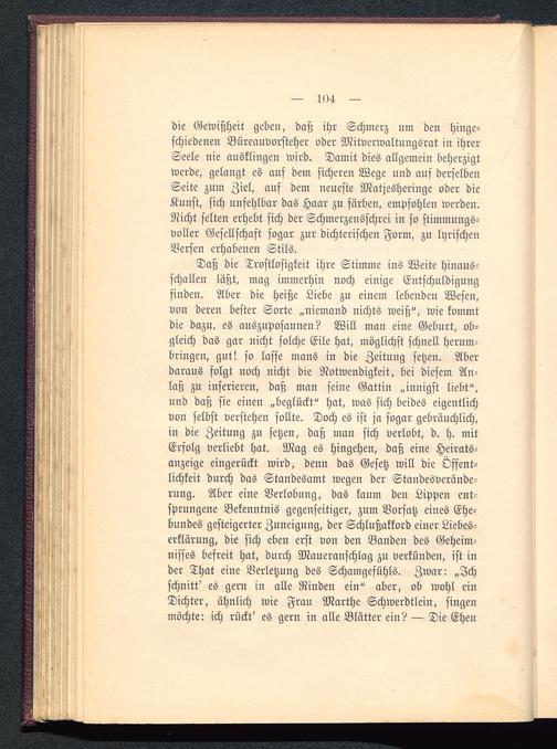 Daß die Trostlosigkeit ihre Stimme ins Weite hinaus-schallen läßt, mag immerhin noch einige Entschuldigungfinden. Aber die heiße Liebe zu einem lebenden Wesen,von deren bester Sorte „niemand nichts weiß", wie kommtdie dazu, es auszuposaunen? Will man eine Geburt, ob-gleich das gar uicht solche Eile hat, möglichst schnell herum-bringen, gut! so lasse mans in die Zeitnng setzen. Aberdaraus folgt uoch nicht die Notwendigkeit, bei diesem An-laß zu inserieren, daß man seine Gattin „innigst liebt",und daß sie einen „beglückt" hat, was sich beides eigentlichvon selbst verstehen sollte. Doch es ist ja sogar gebräuchlich,in die Zeitung zu setzen, daß man sich verlobt, d. h. mitErfolg verliebt hat. Mag es hingehen, daß eine Heirats-anzeige eingerückt wird, denn das Gesetz will die Öffent-lichkeit durch das Standesamt wegen der Standesverände-rung. Aber eine Verlobung, das kaum den Lippen ent-sprungene Bekenntnis gegenseitiger, zum Vorsatz eines Ehe-bundes gesteigerter Zuneigung, der Schlußakkord einer Liebes-erklärung, die sich eben erst von den Banden des Geheim-nisses befreit hat, durch Maueranschlag zu verkünden, ist inder That eine Verletzung des Schamgefühls. Zwar: „Ichschnitt' es gern in alle Rinden ein" aber, ob Wohl einDichter, ähnlich wie Frau Marthe Schwerdtlein, singenmöchte: ich rückt' es gern in alle Blätter ein? — Die Ehen