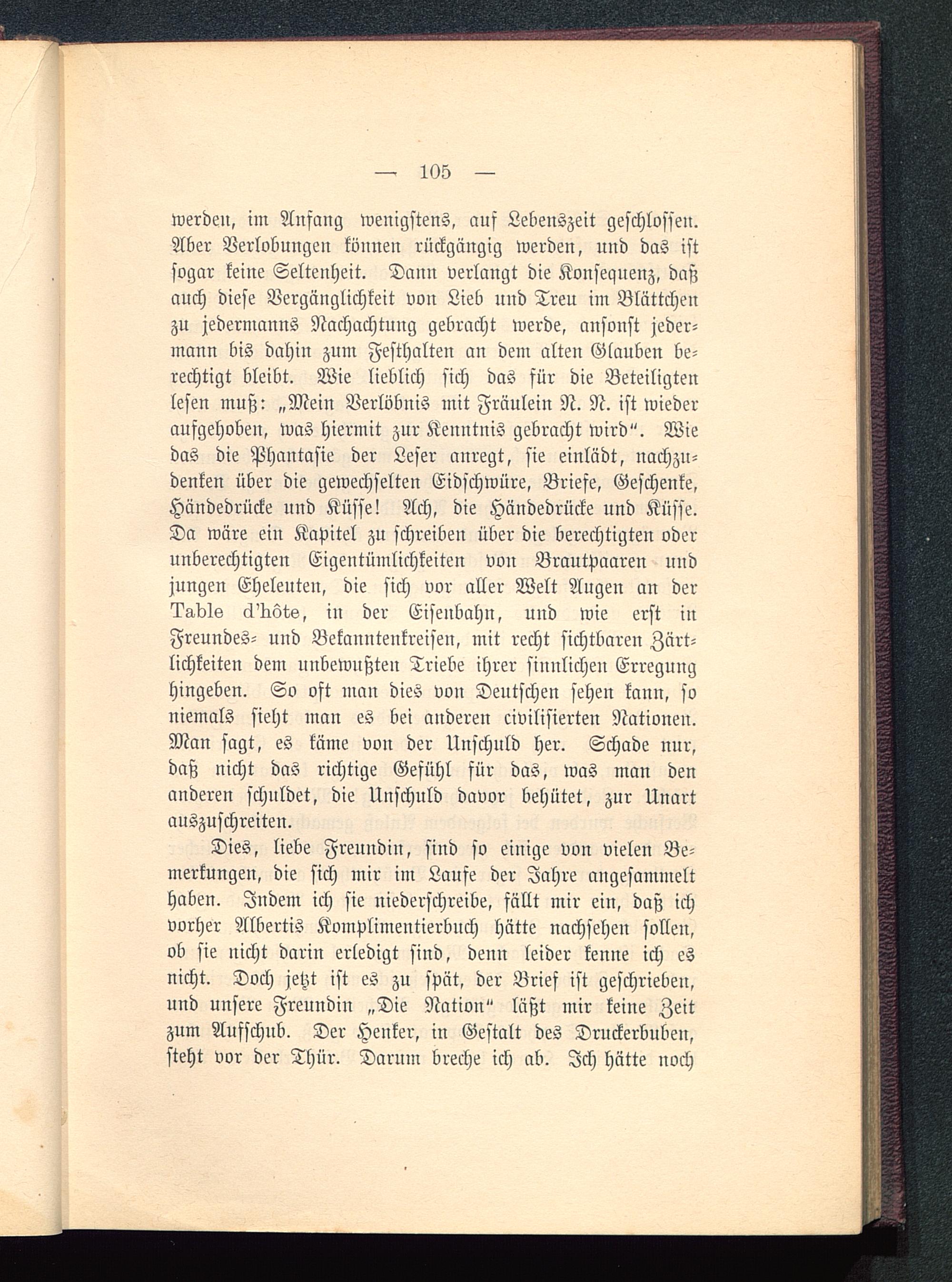 Dies, liebe Freundin, sind so einige von vielen Be-merkungen, die sich mir im Laufe der Jahre angesammelthaben. Indem ich sie niederschreibe, fällt mir ein, daß ichvorher Albertis Komplimentierbuch hätte nachsehen sollen,ob sie nicht darin erledigt sind, denn leider kenne ich esnicht. Doch jetzt ist es zu spät, der Brief ist geschrieben,und unsere Freundin „Die Nation" läßt mir keine Zeitzum Aufschub. Der Henker, in Gestalt des Druckerbuben,steht vor der Thür. Darum breche ich ab. Ich hätte noch